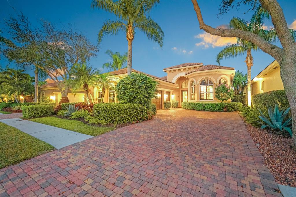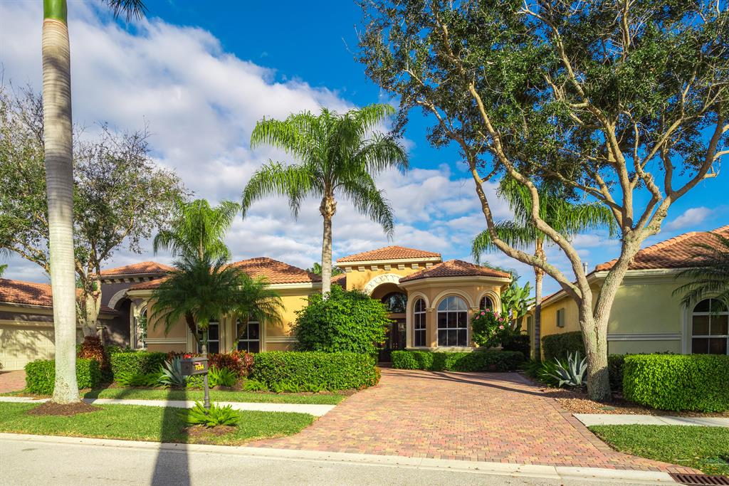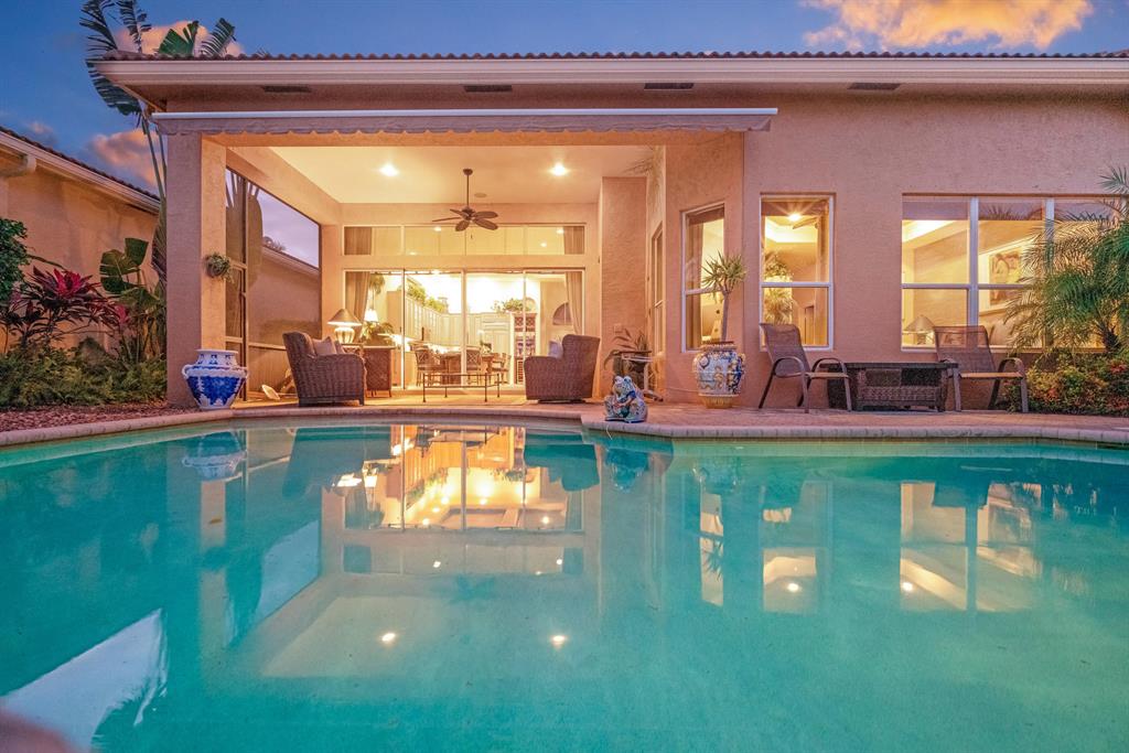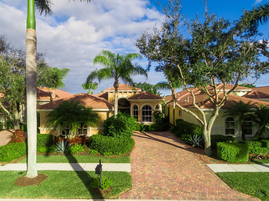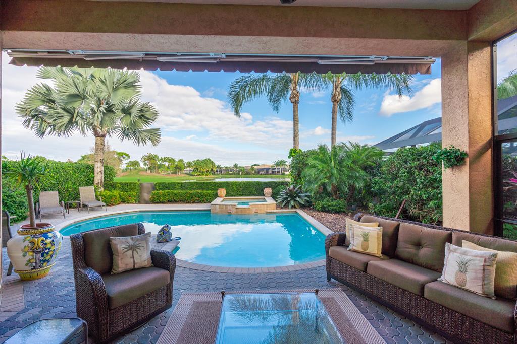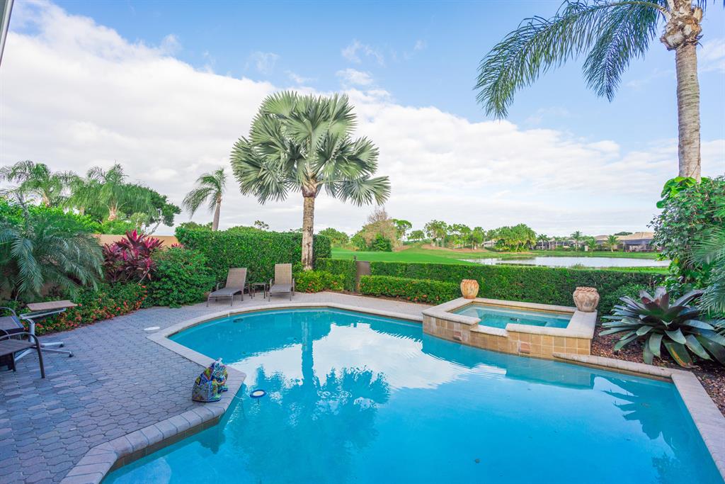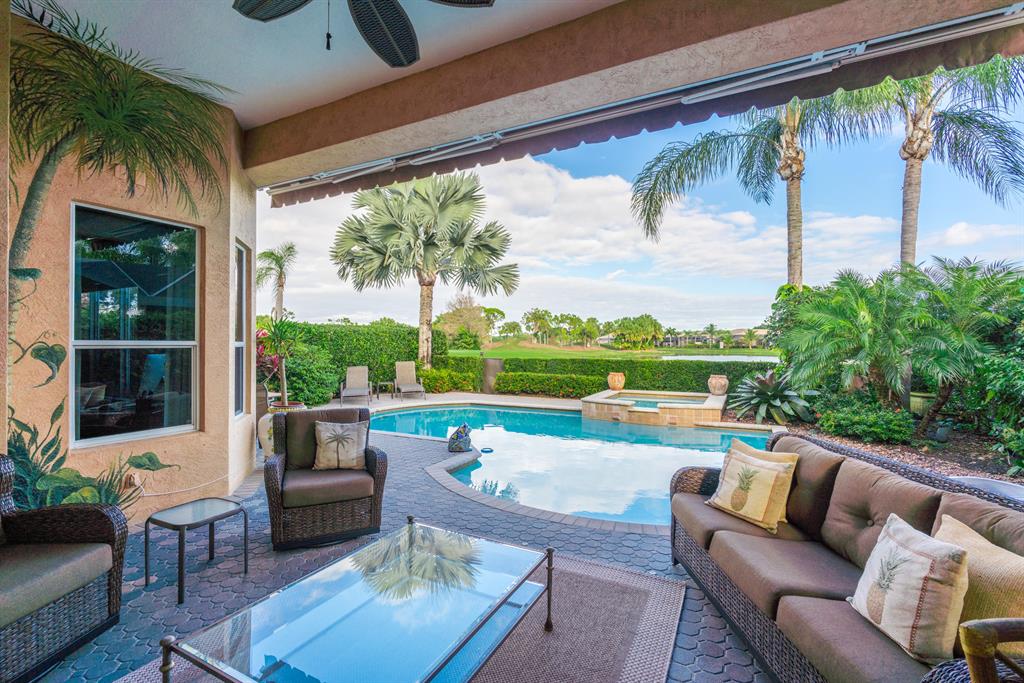 Enjoy golf and water views while living in paradise in this very special, luxurious, 3BR/3BA + Den open-plan estate home situated on the 3rd fairway of the Tradition course in the prestigious private community of The Club at Ibis. High-end features include volume coffered & tray ceilings with crown molding & recessed lighting, high-end engineered wood flooring & porcelain flooring laid on the diagonal, granite countertops, a coral fireplace, sound system throughout, stained glass, newer stainless steel appliances, and large windows and sliding glass doors. The patio is an outdoor oasis and has a covered seating area, retractable awning, a swimming pool with attached spa, and paver flooring.