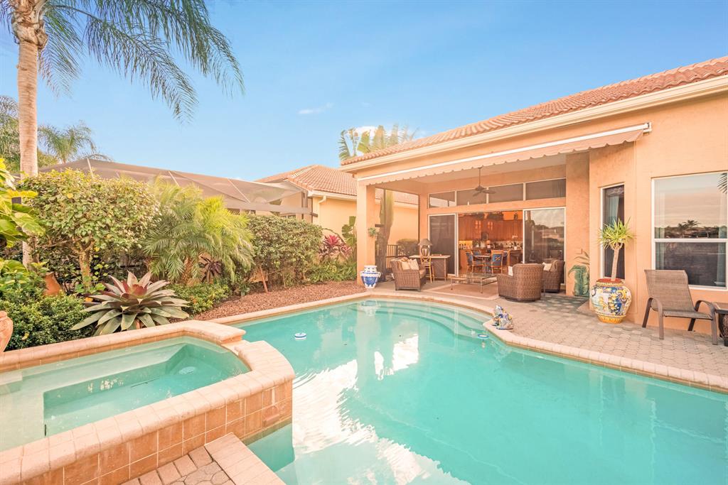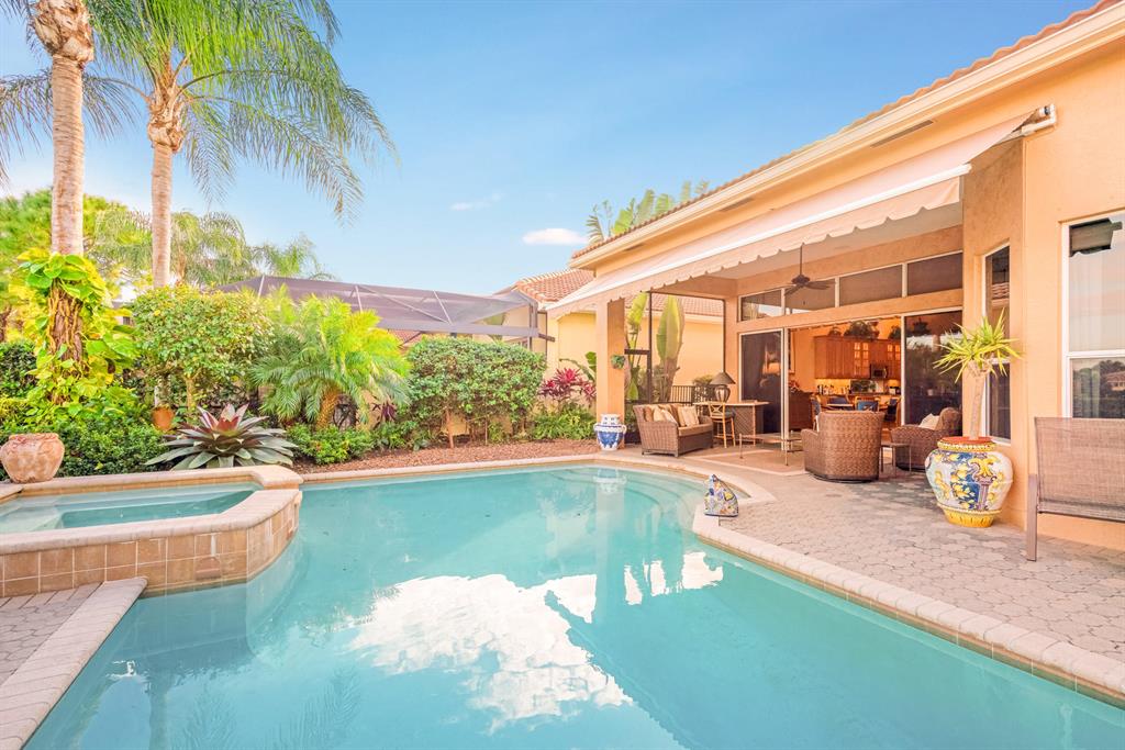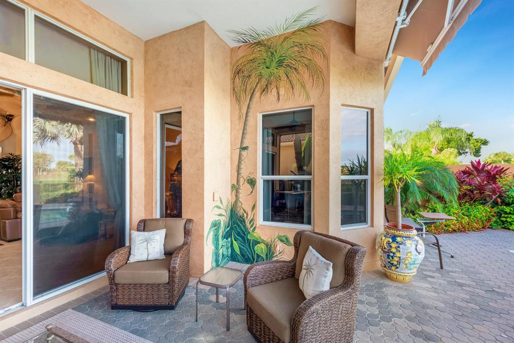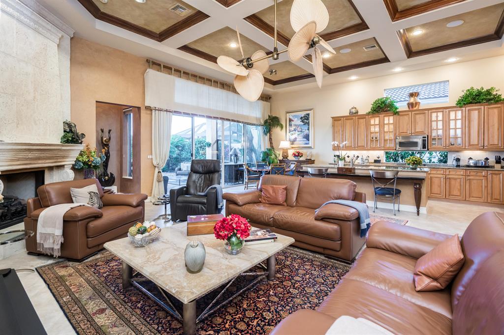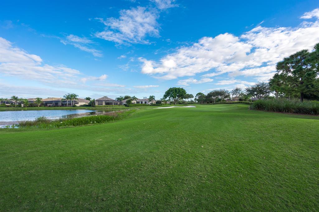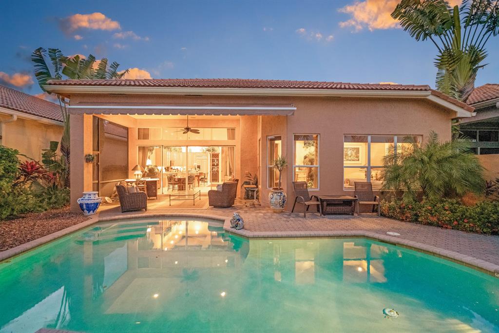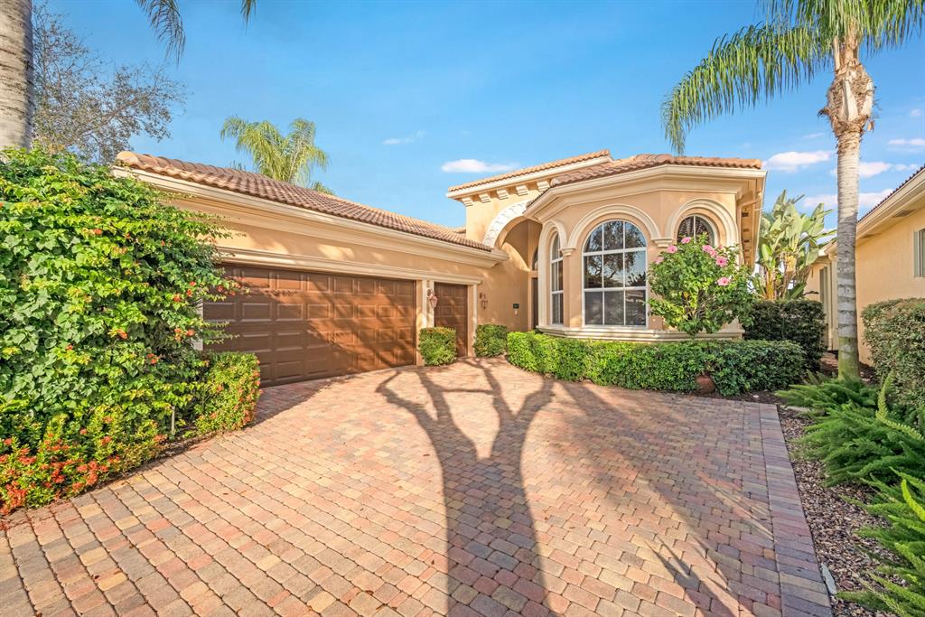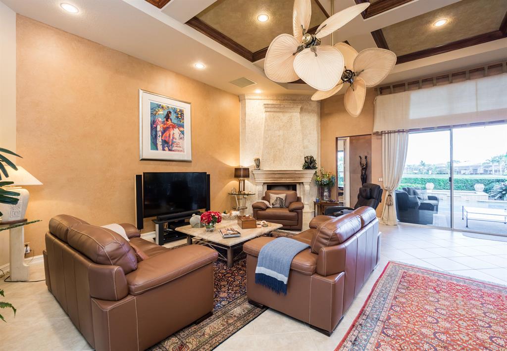 Enjoy golf and water views while living in paradise in this very special, luxurious, 3BR/3BA + Den open-plan estate home situated on the 3rd fairway of the Tradition course in the prestigious private community of The Club at Ibis. High-end features include volume coffered & tray ceilings with crown molding & recessed lighting, high-end engineered wood flooring & porcelain flooring laid on the diagonal, granite countertops, a coral fireplace, sound system throughout, stained glass, newer stainless steel appliances, and large windows and sliding glass doors. The patio is an outdoor oasis and has a covered seating area, retractable awning, a swimming pool with attached spa, and paver flooring.