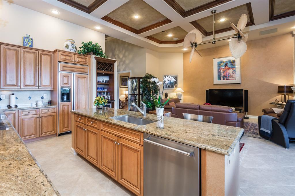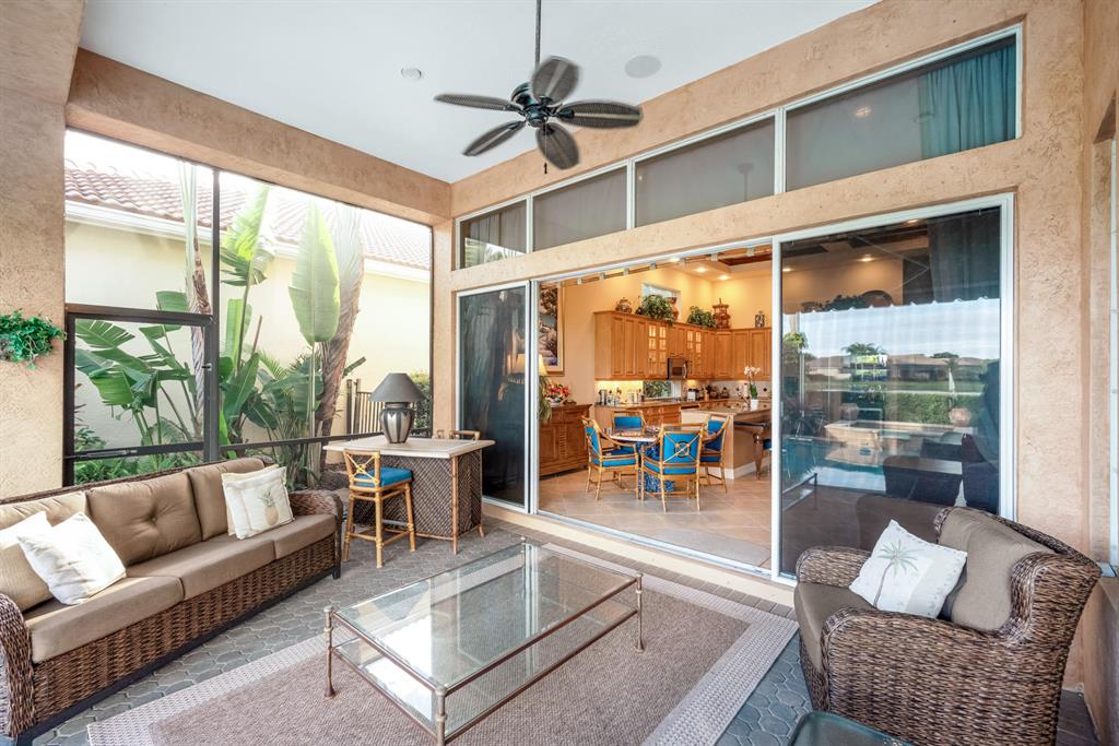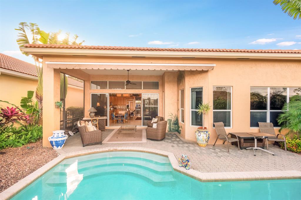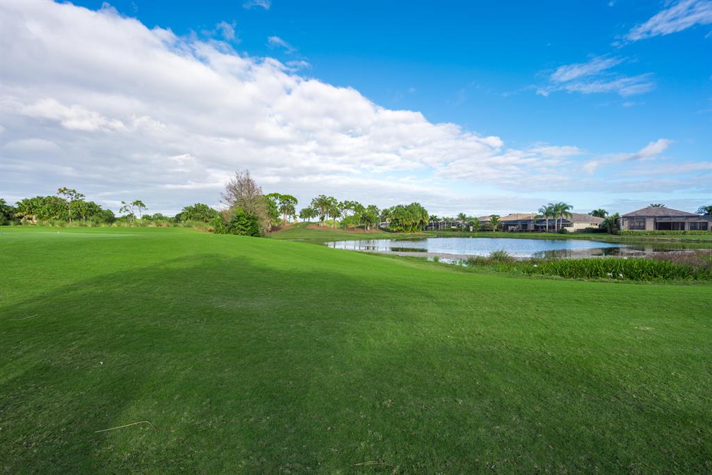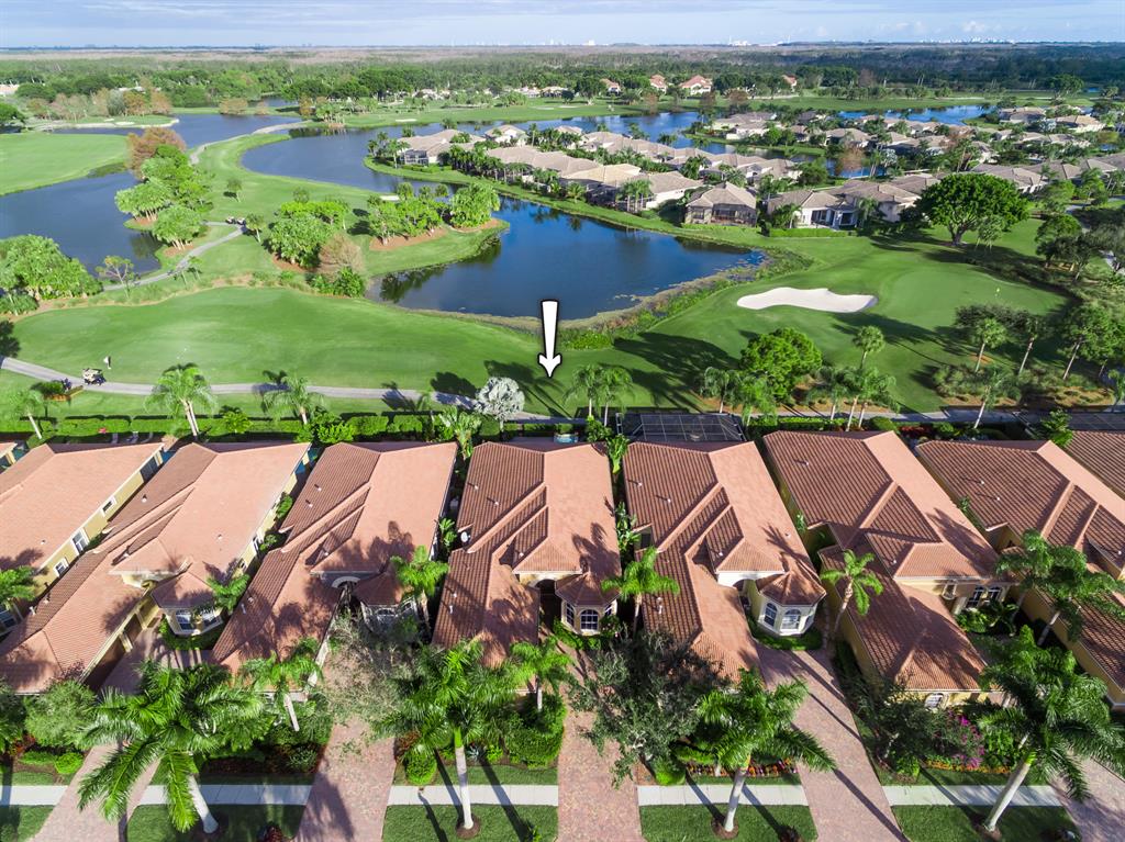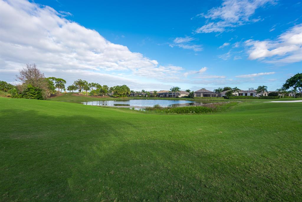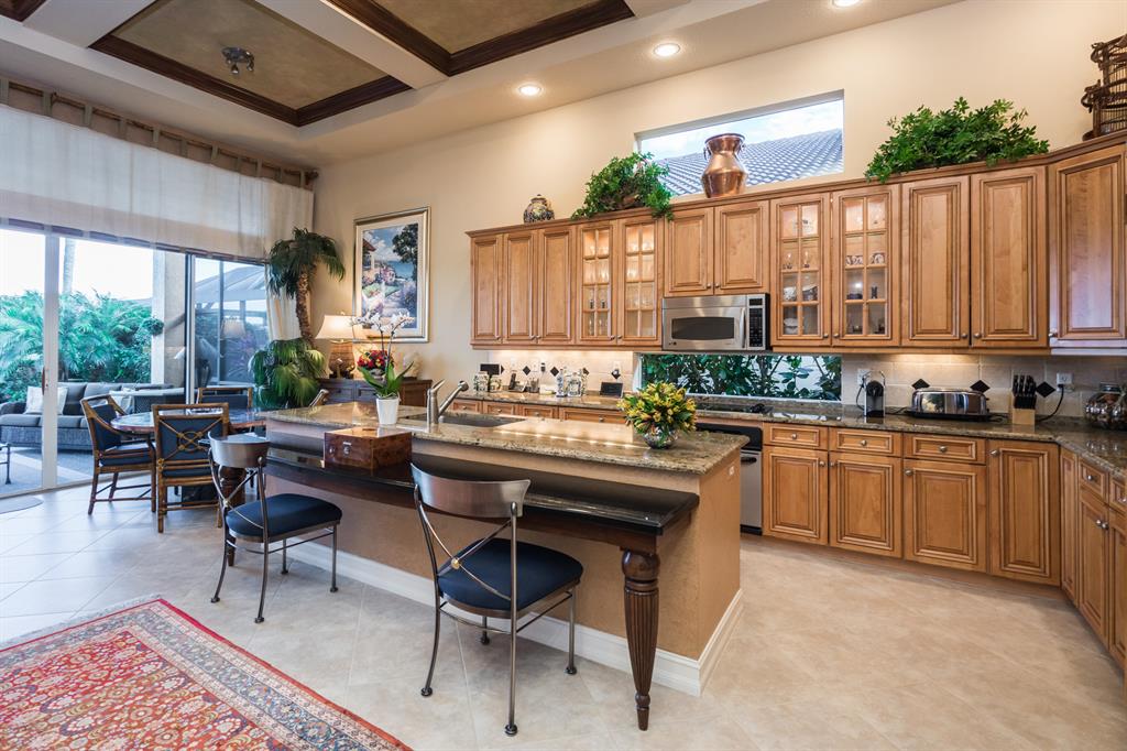 Enjoy golf and water views while living in paradise in this very special, luxurious, 3BR/3BA + Den open-plan estate home situated on the 3rd fairway of the Tradition course in the prestigious private community of The Club at Ibis. High-end features include volume coffered & tray ceilings with crown molding & recessed lighting, high-end engineered wood flooring & porcelain flooring laid on the diagonal, granite countertops, a coral fireplace, sound system throughout, stained glass, newer stainless steel appliances, and large windows and sliding glass doors. The patio is an outdoor oasis and has a covered seating area, retractable awning, a swimming pool with attached spa, and paver flooring.