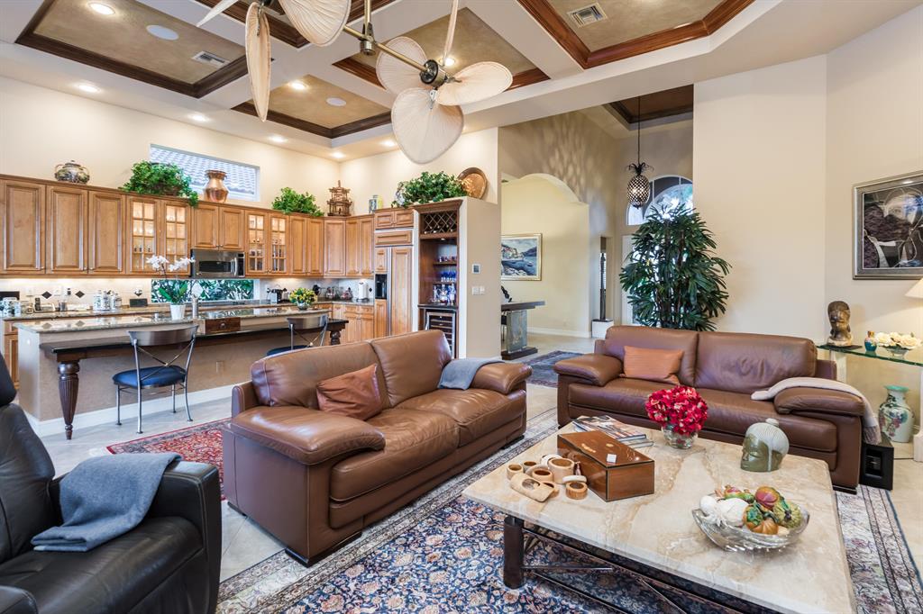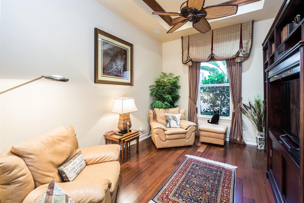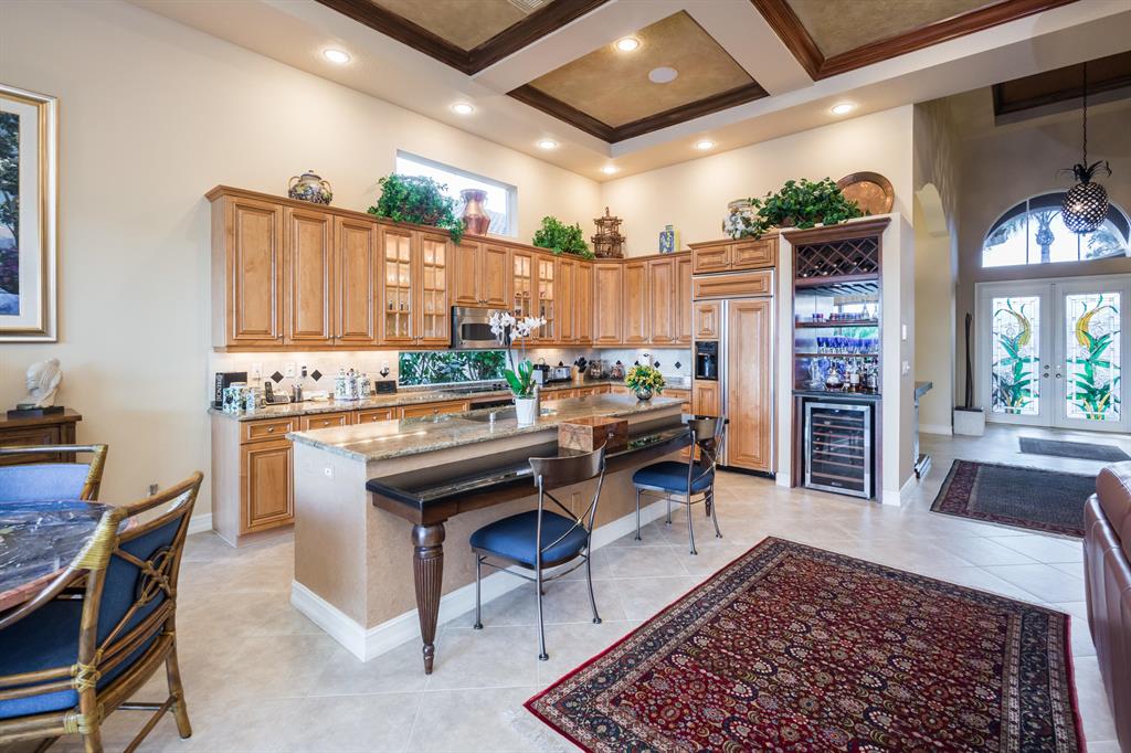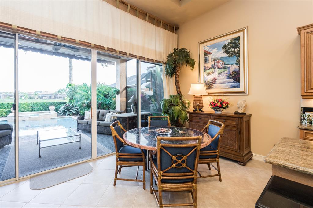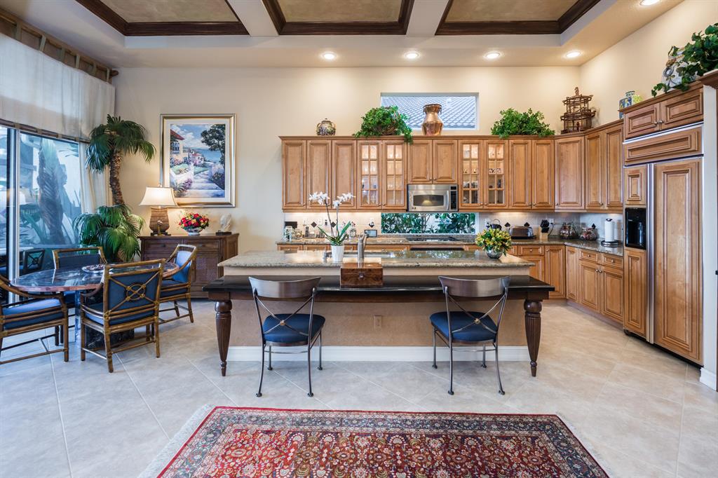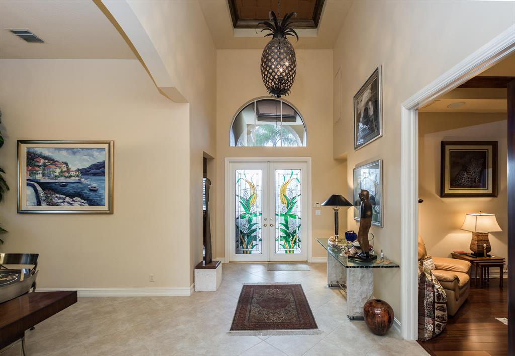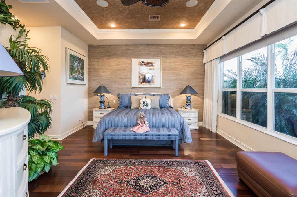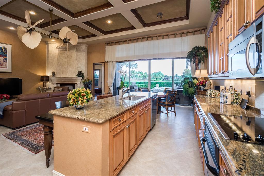 Enjoy golf and water views while living in paradise in this very special, luxurious, 3BR/3BA + Den open-plan estate home situated on the 3rd fairway of the Tradition course in the prestigious private community of The Club at Ibis. High-end features include volume coffered & tray ceilings with crown molding & recessed lighting, high-end engineered wood flooring & porcelain flooring laid on the diagonal, granite countertops, a coral fireplace, sound system throughout, stained glass, newer stainless steel appliances, and large windows and sliding glass doors. The patio is an outdoor oasis and has a covered seating area, retractable awning, a swimming pool with attached spa, and paver flooring.