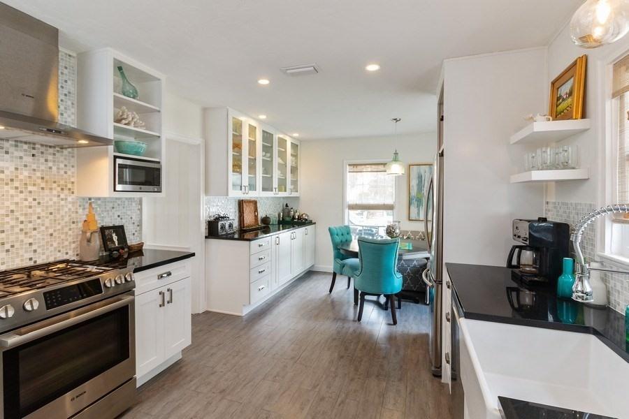 1925 Charmer in the heart of Flamingo Park! This Florida vernacular home has easy, breezy coastal style and is updated to please. Vaulted ceilings and lots of light give the living room an airy feel. The original hardwood floors are gleaming and there is a stately mantle over the fireplace. Off of the living room is a small sunroom with brick flooring and built in shelving for a perfect reading nook.The kitchen is recently updated with white cabinetry and black Absolute granite with a backsplash of glass mosaic tile and a white farmhouse sink. Stainless steel appliances include a side-by-side refrigerator, a Bosch dishwasher and a Bosch gas range with stainless hood. The GE washer and dryer are cleverly hidden behind cabinetry.