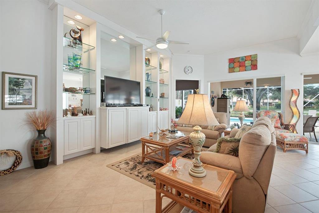 This Fabulous Lakeside, Beautifully Updated, Oakmont is on a Lush (having over $25,000 in Professional Landscaping Enhancements & a 12 Volt Automatic Landscape Lighting System), Cul de Sac Large Premium Lot with Breathtaking Views from the Gorgeous Caged(recently updated and joints reinforced) Heated Swimming Pool & All of the Sliding Glass Doors, of Lakes, Bridges, Green Space & Walkways! The Covered Screened Entry opens to the Foyer that leads to the Double Door Den/Office with Furniture Quality Built-in Bookcases & Desk, with 2 Clerestory Windows & the Great Room a Full Wall Entertainment Center, 12 ft. Ceiling that opens to the Dining Area with Sliding Glass Doors to a Secluded Patio, plus 18 ft. of Sliding Glass Doors that lead to the 22 ft. Lanai that opens to the Screened Pool.