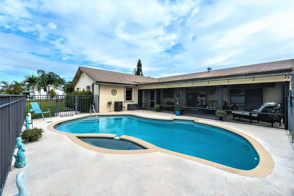 Spectacular lakefront 3 bedroom, 2 bathroom, pool home on a very large(over 1/4 acre) lot with a stunning lake view with amazing sunsets, home is very charming and has many upgraded features including full hurricane accordion shutters, new impact door in cabana bath, refinished & re-tiled pool, New Trane A/C with new vents, updated patio enclosure, New Electrical panels(inside&outside), remodeled guest bath and master shower, updated SS appliances and newer washer/dryer, two guest bedrooms updated with vinyl/wood planks and baseboards, all new ceiling fans, newer pool equipment and sprinkler pump, security lighting and gorgeous landscaping, fenced side yard, come see this very spacious home and enjoy the Florida lifestyle to it's fullest! Community offers park and facilities to enjoy.
