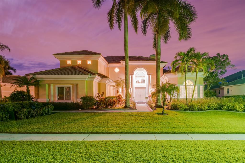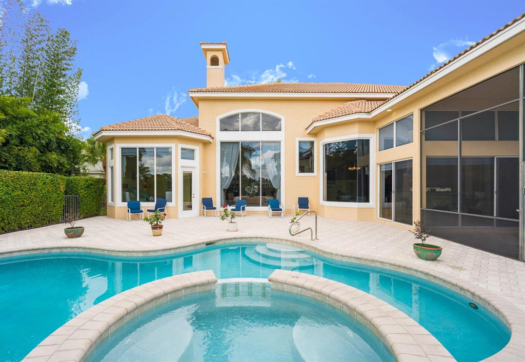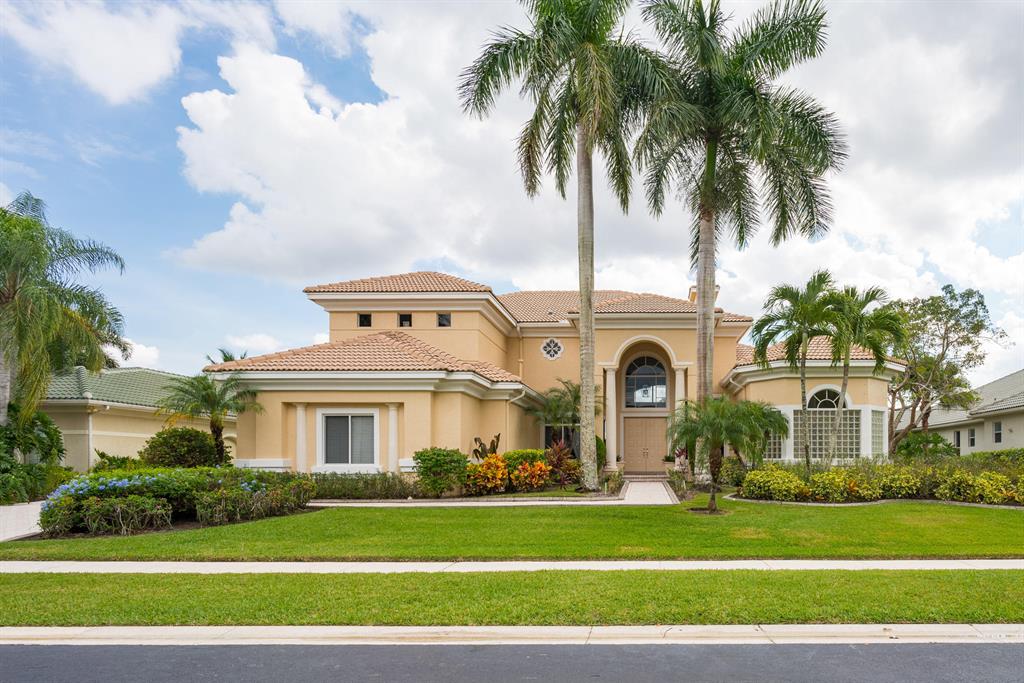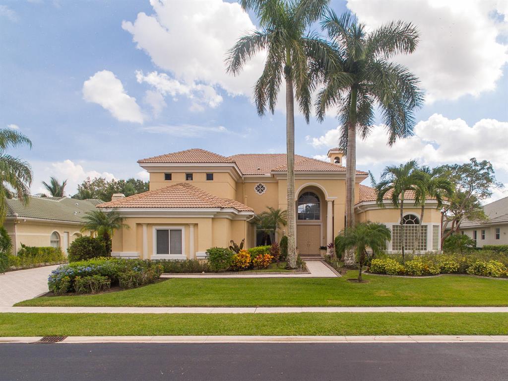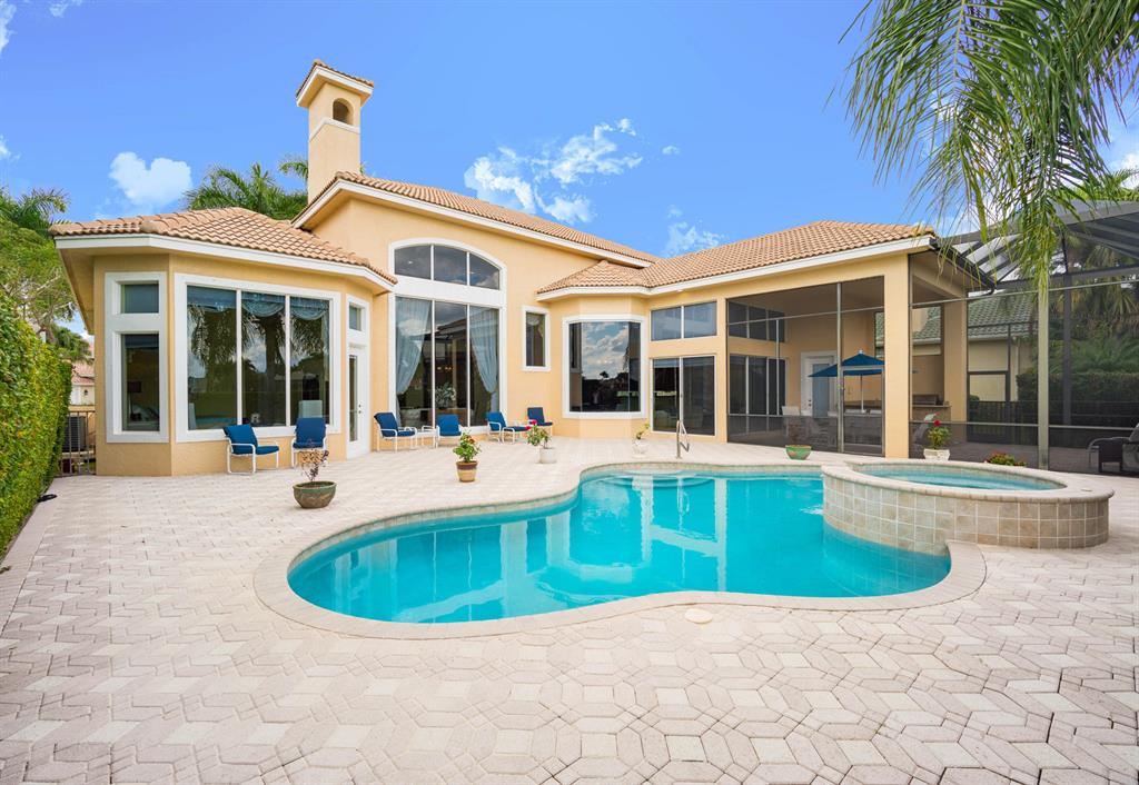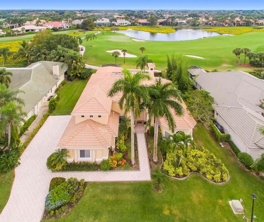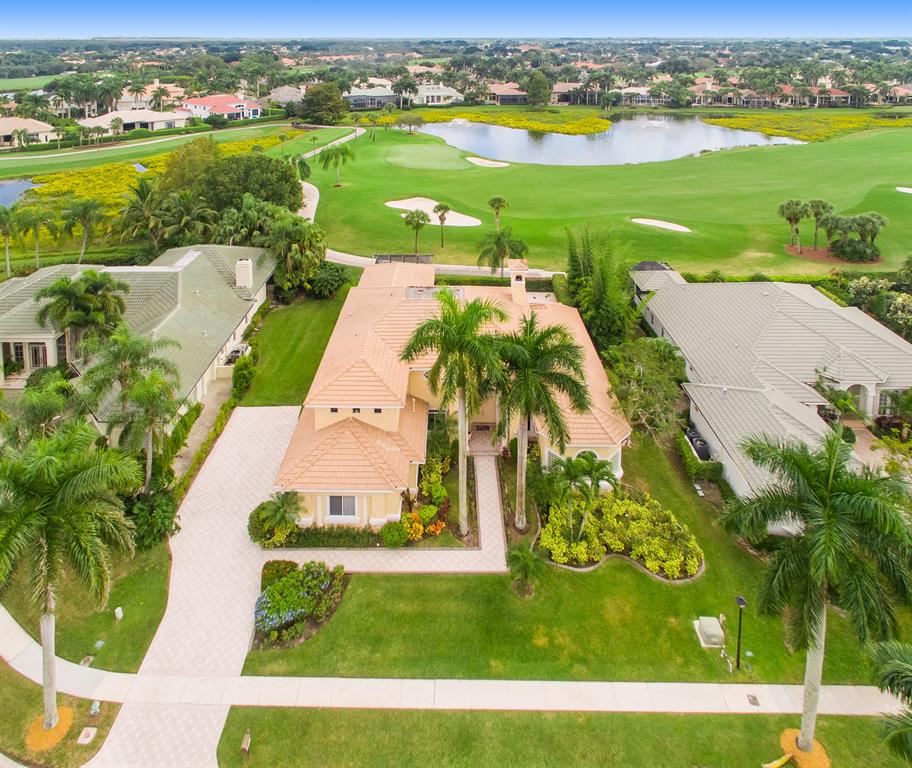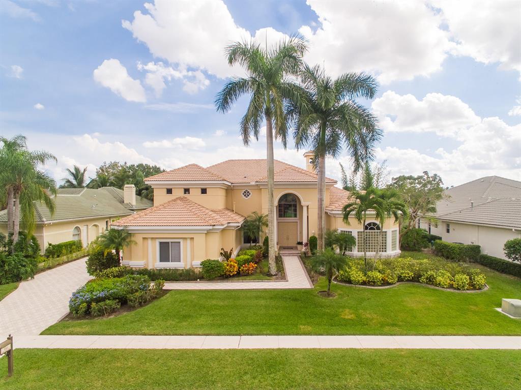 Amazing golf & lake views surround this exceptionally bright, luxurious, meticulously kept, 5BR/4.2BA + den + loft custom model home, located on one of the best lots in the the Egret Lakes community of The Club at Ibis. Desirable features of this split-plan home include a grand marble staircase and marble flooring, soaring 2-story ceilings, a floor-to-ceiling fireplace in the living room, eat-in kitchen with granite countertops and large pantry, a large master suite with wood-look Italian tile flooring, and an expansive paver patio with a granite summer kitchen and a resurfaced salt water pool which overlooks the 4th hole of the Legend Golf Course. Garage has tile flooring, granite countertops, and cabinets.