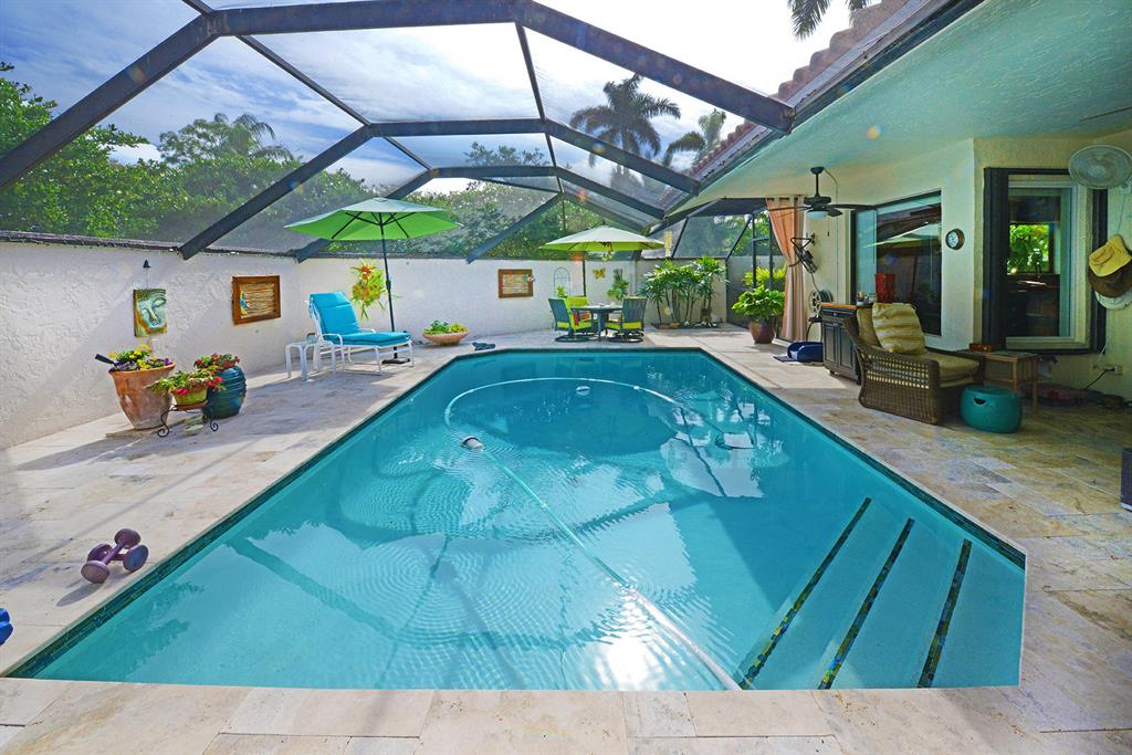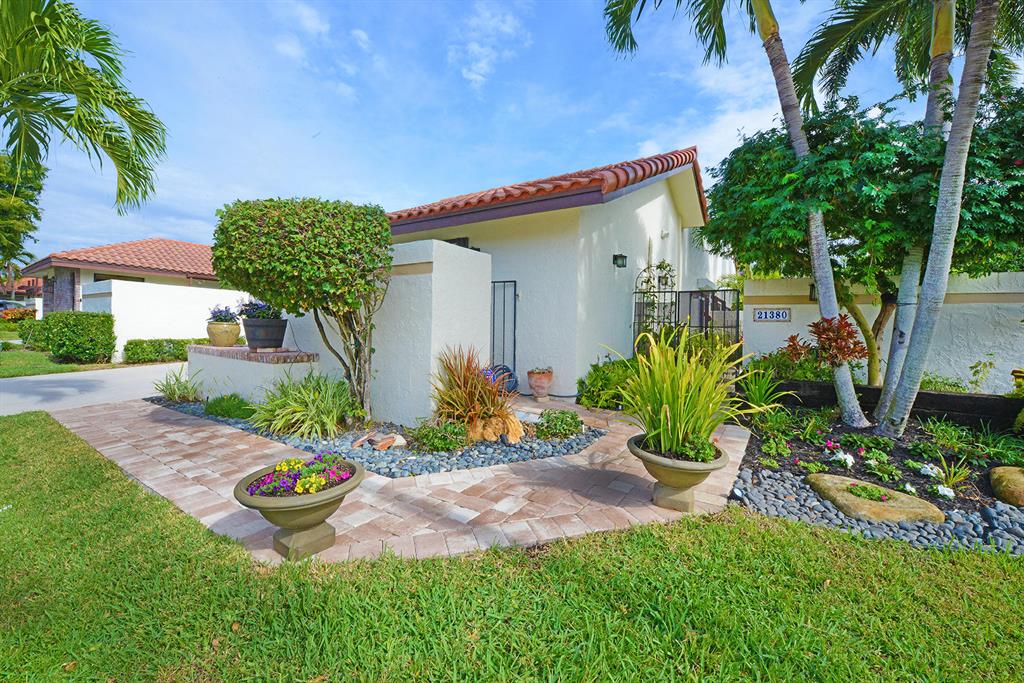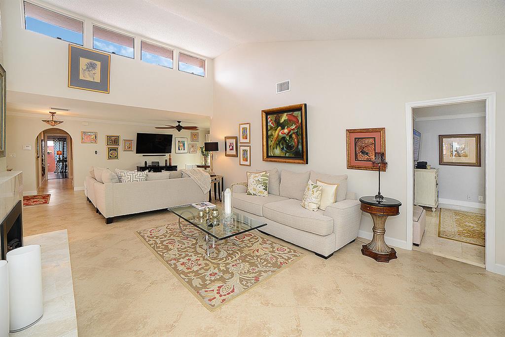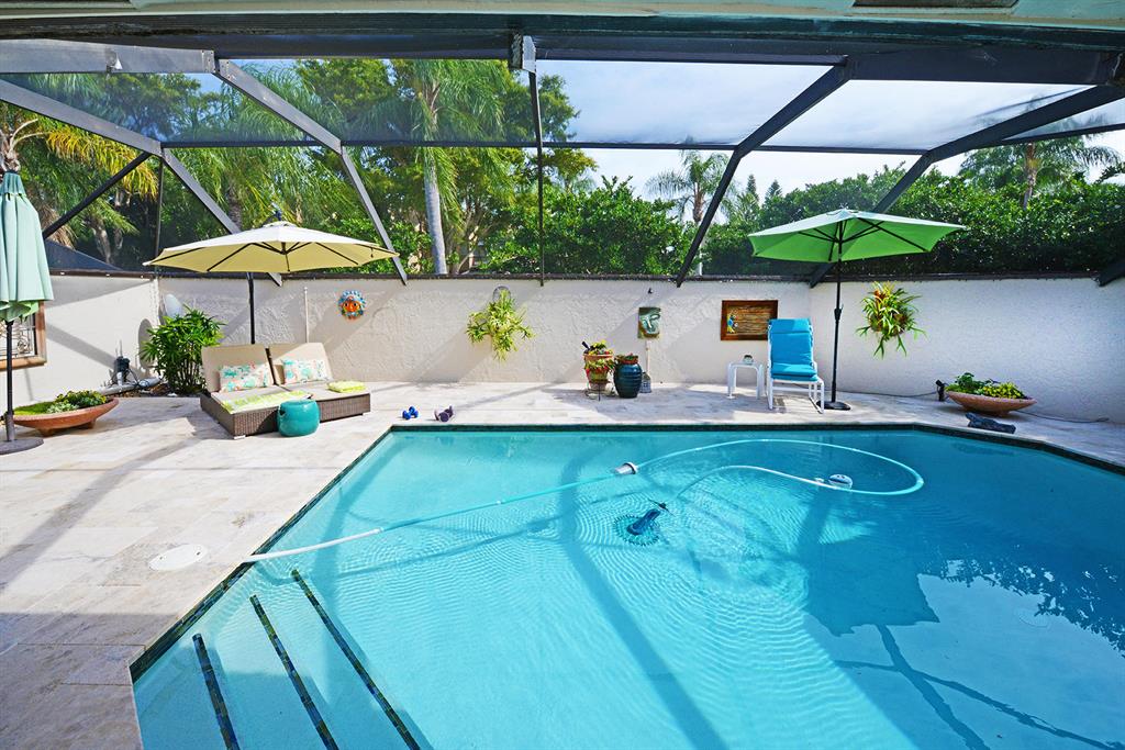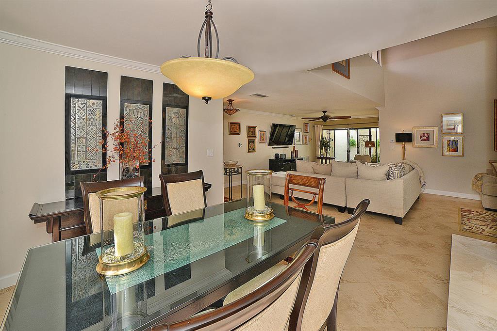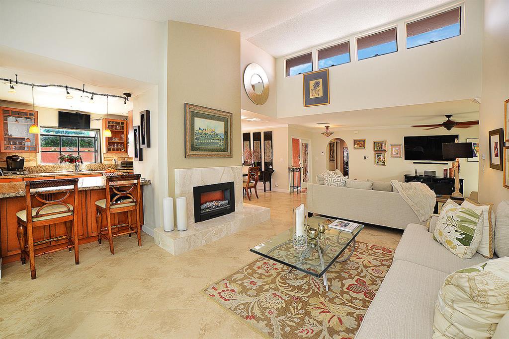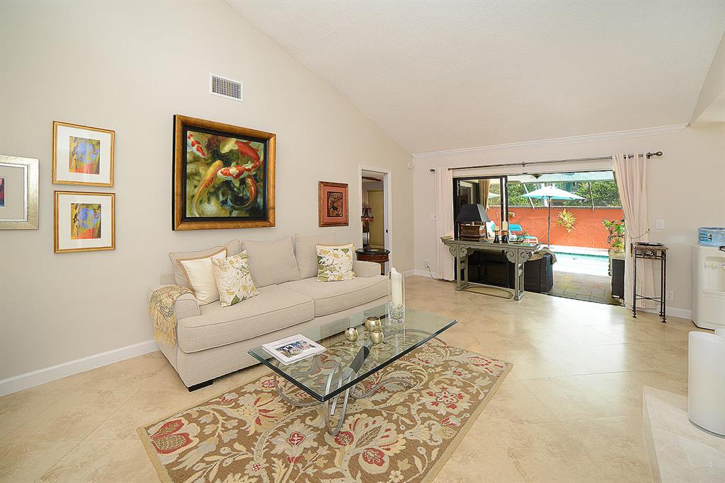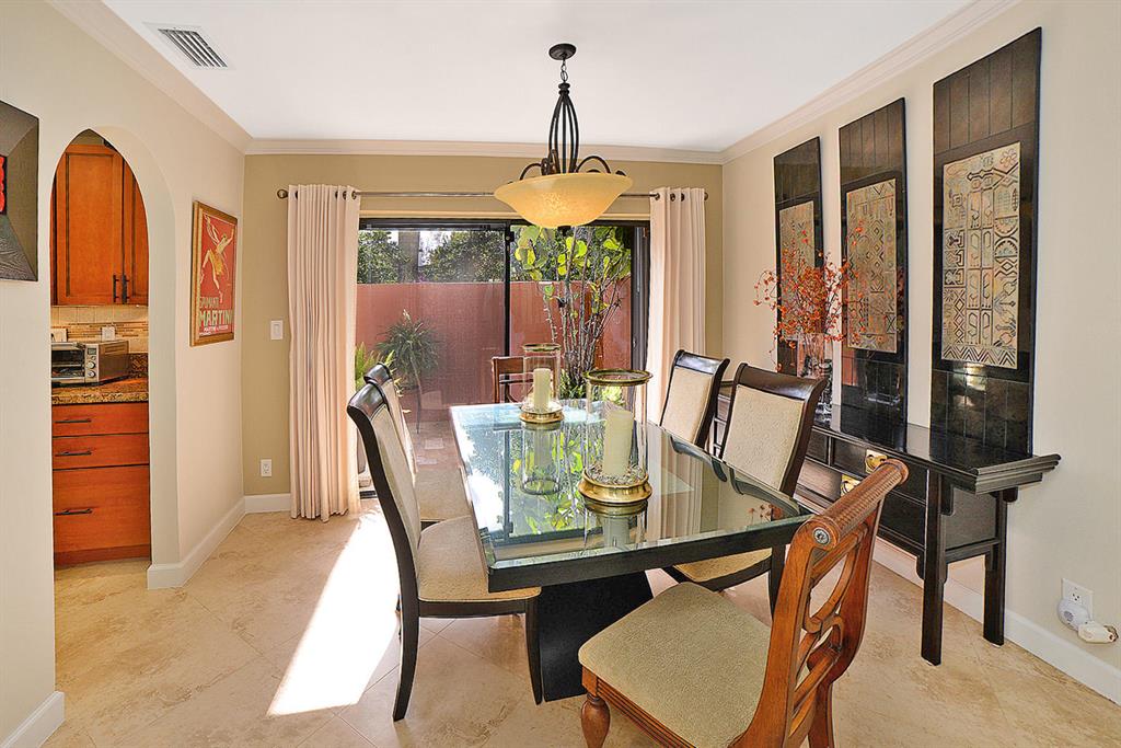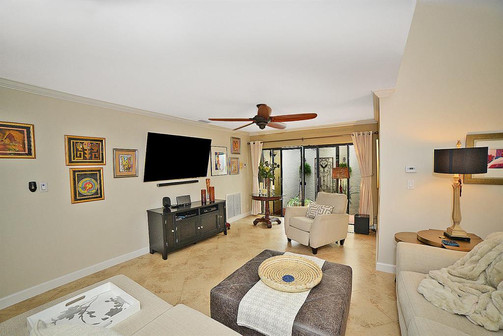 Updated single family--corner lot--2 bedroom 2 updated baths--2 car garage--light and airy--Location near Town Center--I-95 and Fl Turnpike--Gated & well maintained--low HOA fees--Med style home--w/ updated pool deck, newer (4 years) roof, A/C & pool heater--full travertine pavered deck and paths through 2 courtyards--Side access through courtyards--Kitchen Stainless steel--granite--fireplace--High ceilings--Pet Friendly--A rated schools--Live in a resort and be on vacation. Courtyard fountain, chandelier & extra fridge in garage DO NOT Convey