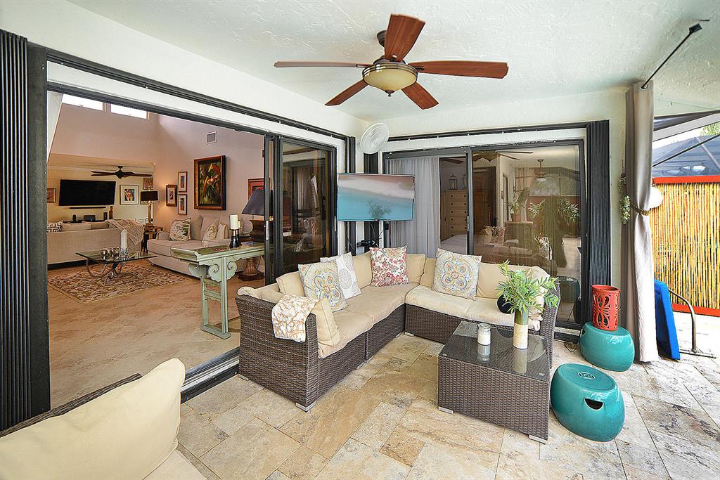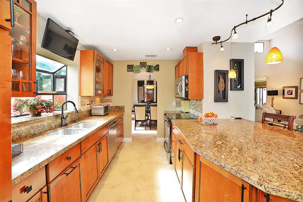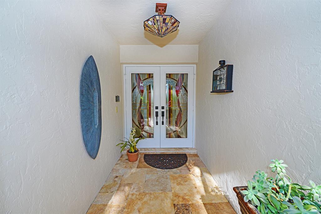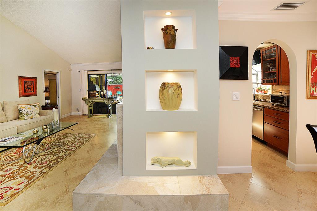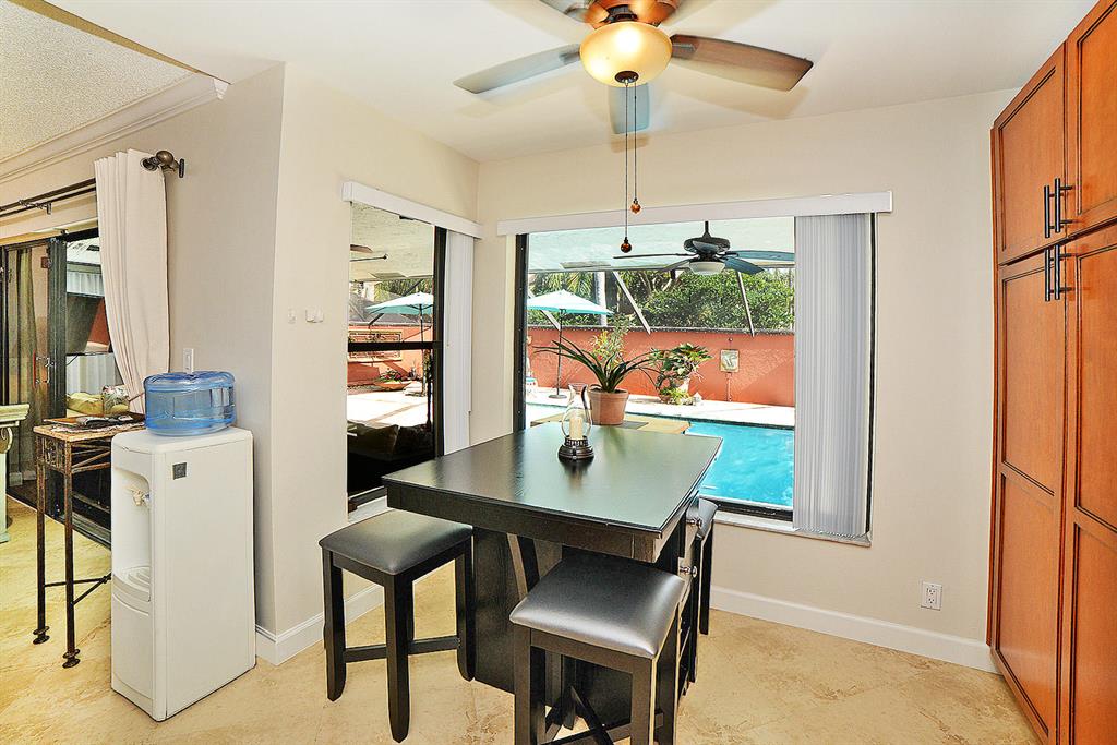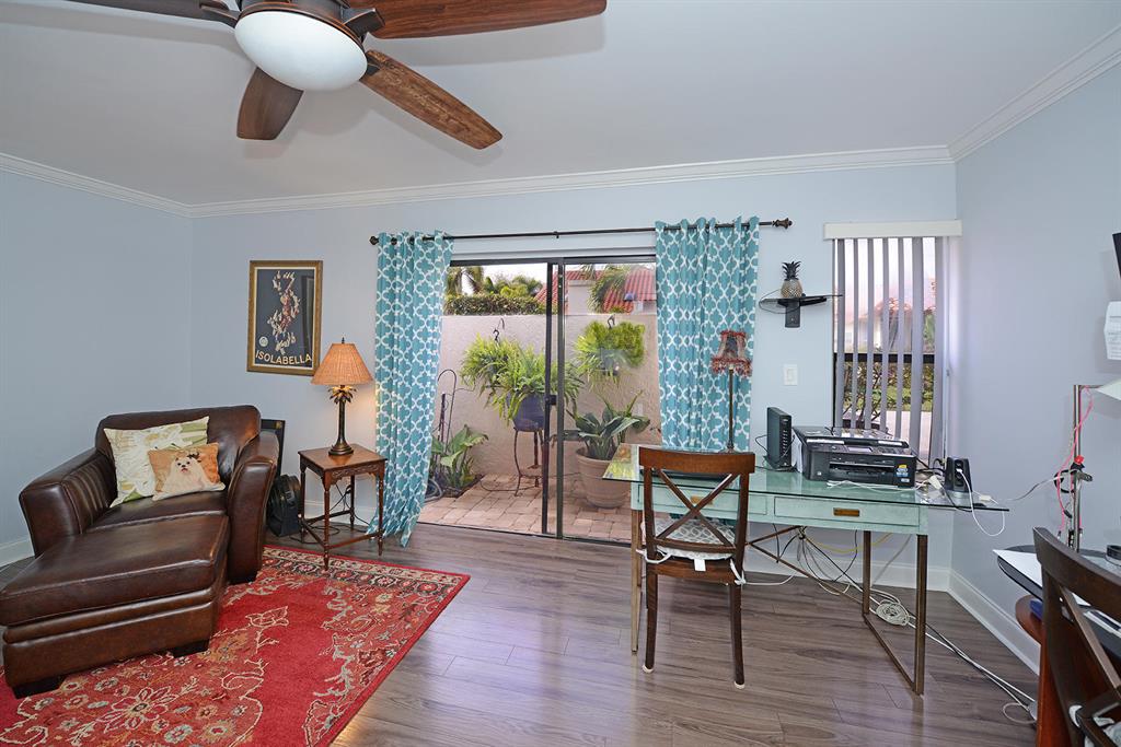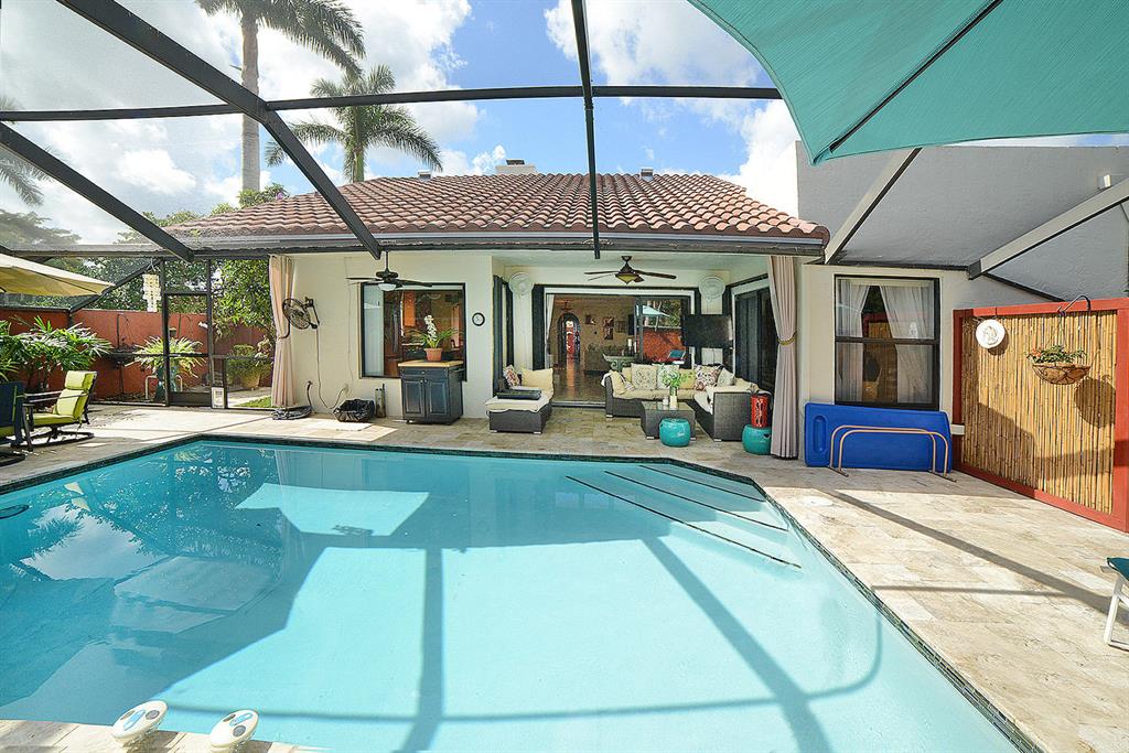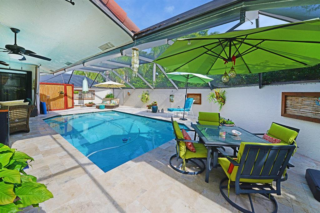 Updated single family--corner lot--2 bedroom 2 updated baths--2 car garage--light and airy--Location near Town Center--I-95 and Fl Turnpike--Gated & well maintained--low HOA fees--Med style home--w/ updated pool deck, newer (4 years) roof, A/C & pool heater--full travertine pavered deck and paths through 2 courtyards--Side access through courtyards--Kitchen Stainless steel--granite--fireplace--High ceilings--Pet Friendly--A rated schools--Live in a resort and be on vacation. Courtyard fountain, chandelier & extra fridge in garage DO NOT Convey