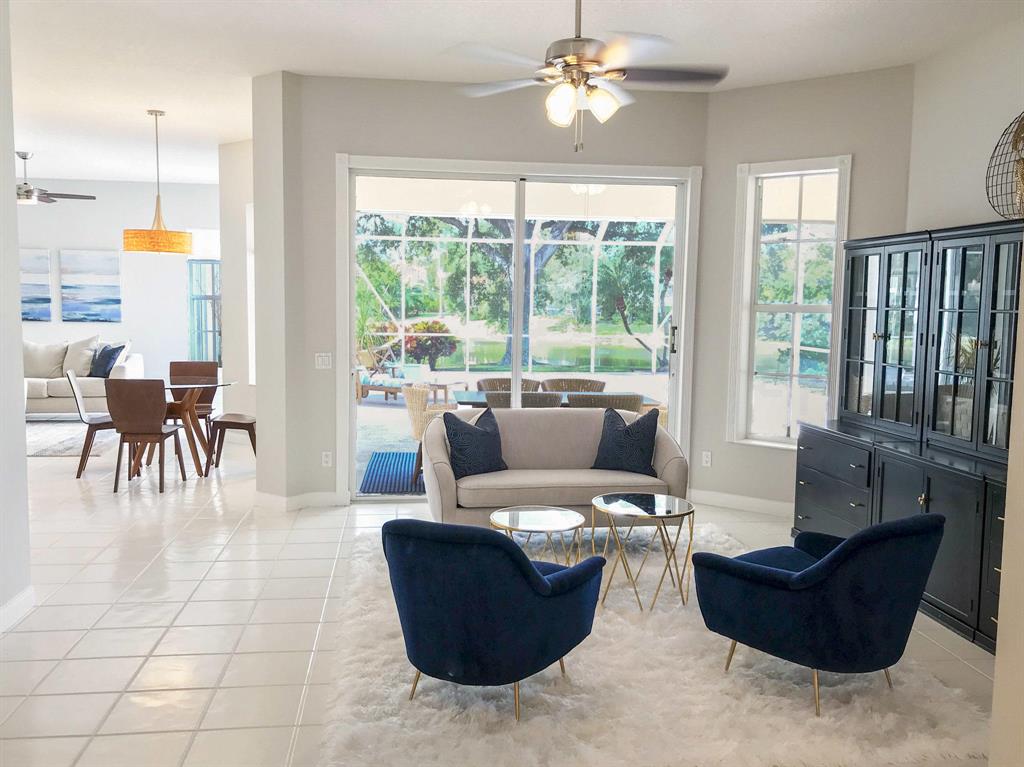 Stunning views of the lake & bridges from the screened patio of this beautiful ''Windsor''! This home has been impeccably maintained with attention to details! Neutral ceramic tile throughout the main living area, & master bedroom high quality carpet & laminate in guest bedrooms. 10ft volume ceilings through out, open kitchen to family room, walk in pantry, upgraded appliances, master bath shower as been upgraded with frameless doors, deep roman tub & double sinks. The covered lanai opens up to a large screened patio, perfect for ''alfresco'' entertaining The 4th bedroom/suite has sliders that exit into the patio area, large walk in closet & private bathroom. This home also has accordian shutters throughout! Short walk over the brige to the Town Centre where you can take advantage of all t