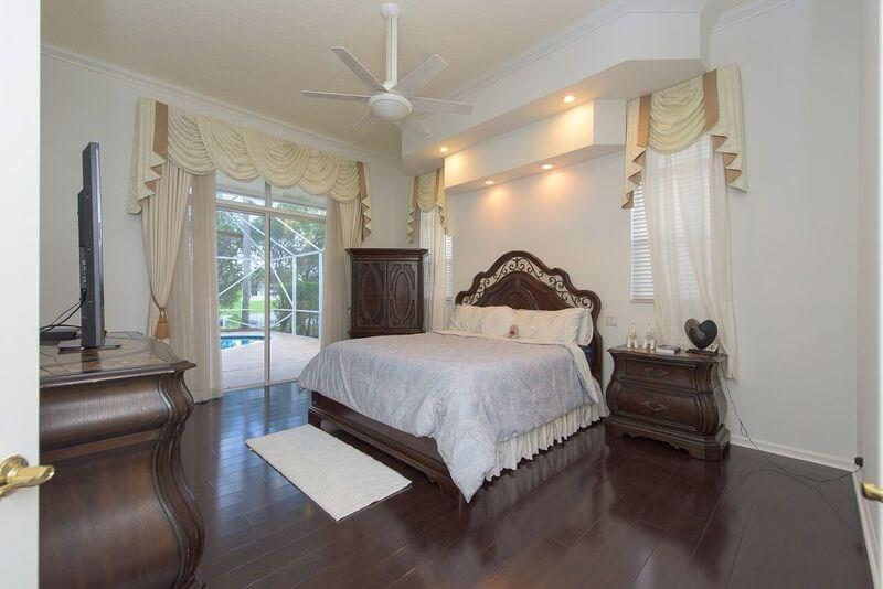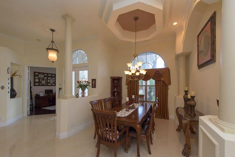 TOTALLY UPGRADED 5/3.5, 3-CAR GARAGE ON MAGNIFICENT WATER LOT WITH HUGE CIRCULAR DRIVEWAY AND PORTE-COCHE ENTRANCE. NEW 24 INCH TILE FLOORS. BRAND NEW MASTER BATH W/TRAVERTINE FLOORS, WHIRLPOOL TUB, GRANITE COUNTERS AND WOOD CABINETS, REMODELED KITCHEN WITH NEWER STAINLESS STEEL APPLIANCES, GRANITE COUNTERS, TUMBLESTONE MARBLE BACKSPLASH. ALL BATHROOMS HAVE BEEN UPDATED WITH GRANITE COUNTERS AND TRAVERTINE FLOORS. BUILT-IN WALL UNIT IN FAMILY ROOM.