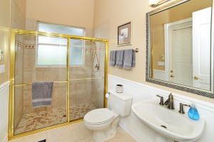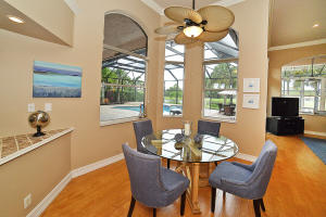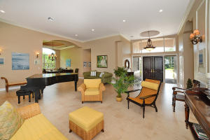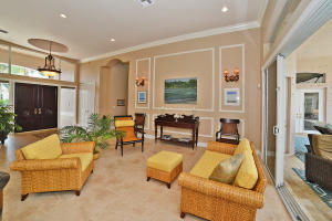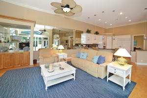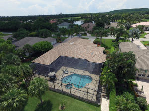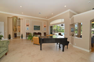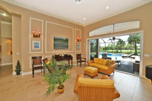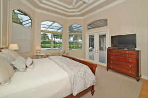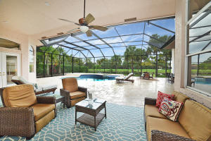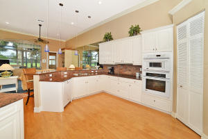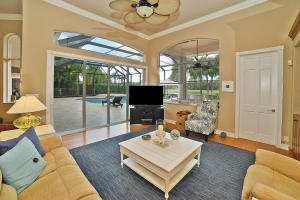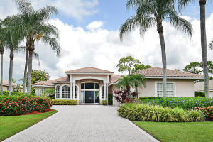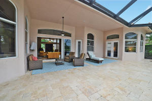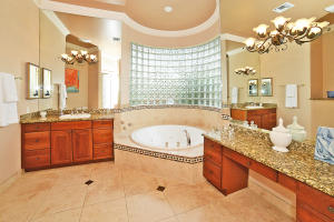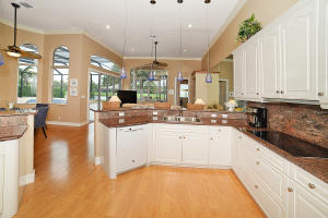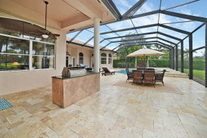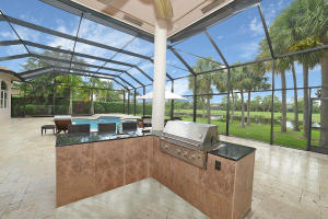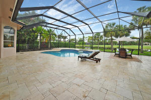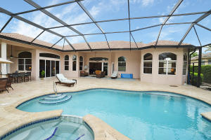 Spectacular from the moment you enter this estate home. You are welcomed with high ceilings, wide open extended floor plan, surrounded with lush landscaping, panoramic lake and golf views from the surrounding rooms. Heated salt water pool and spa, phantom screen with full glass sliding doors in the formal and family rooms. This 4 bedroom 5 and a half bathroom estate home offers designer touches in every room. The kitchen features granite counters and back-splash with under cabinet lighting, large breakfast nook and family room over looking private patio views, master suite features his and her separate bathrooms, triple-coffered crown molding ceiling. This stunning home offers decorative moldings throughout and sits on a 1/2 acre with newer travertine marbled patio and a summer kitchen.
