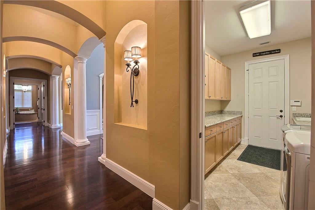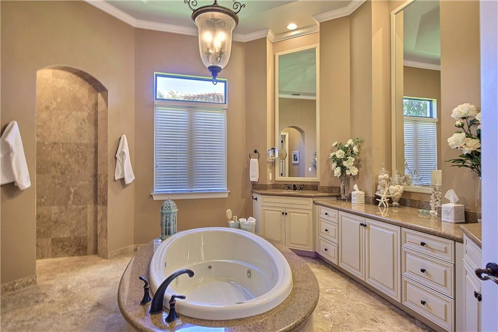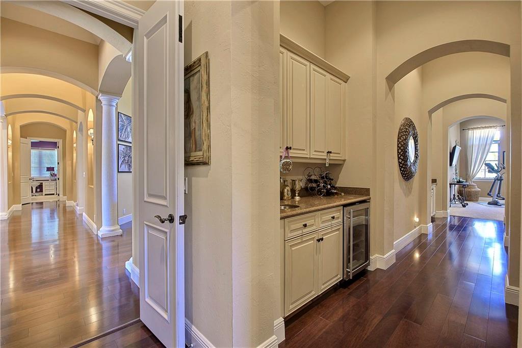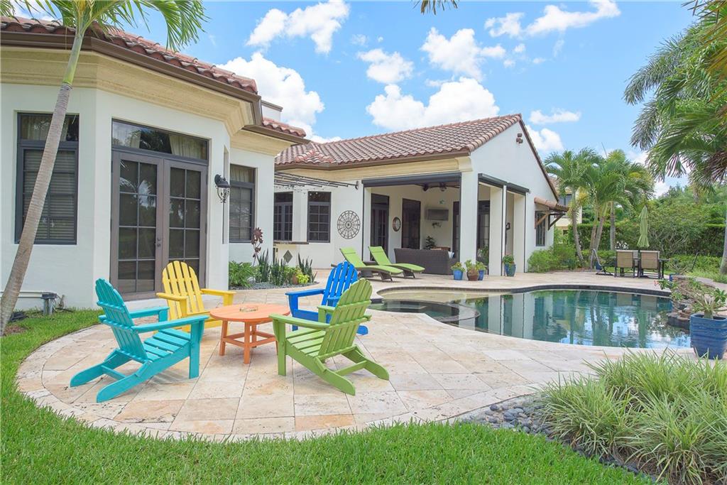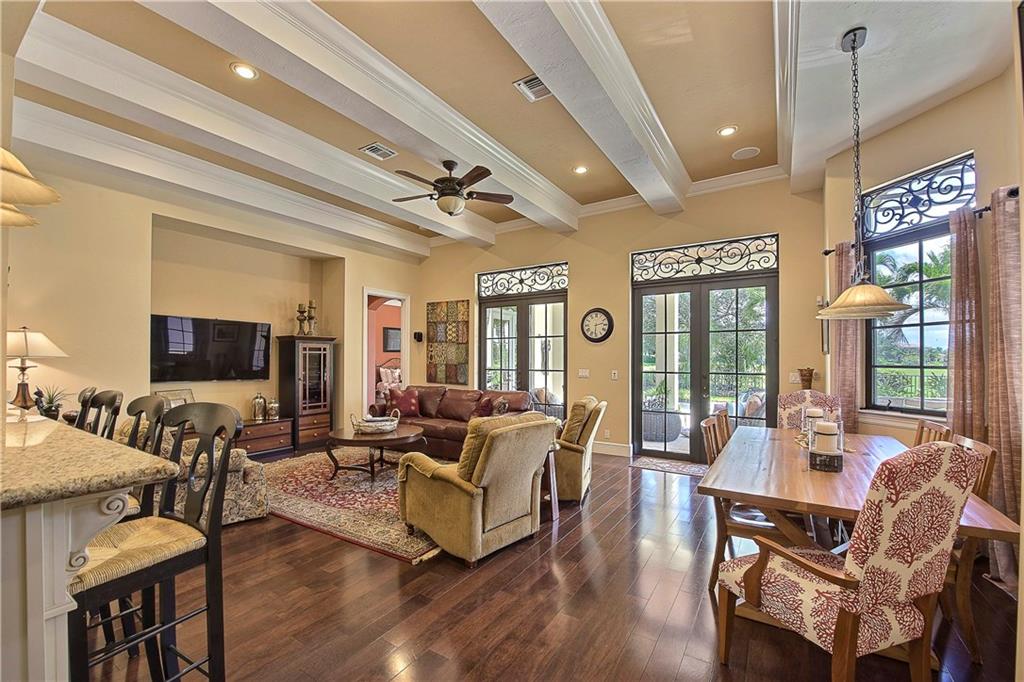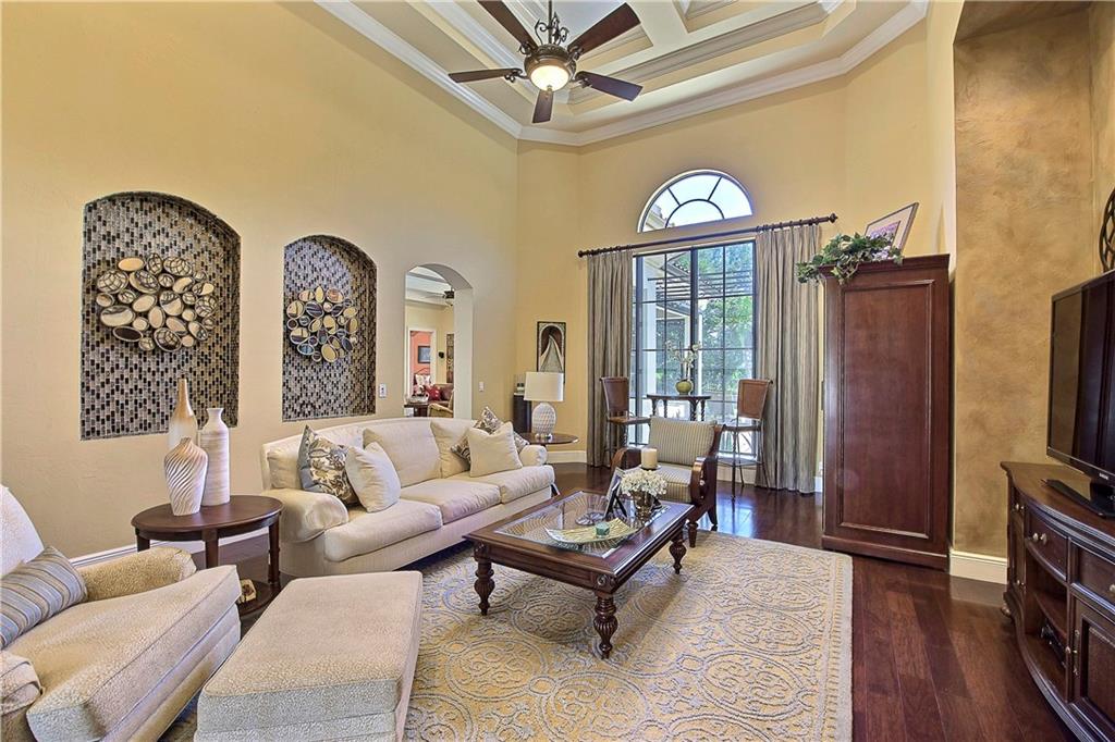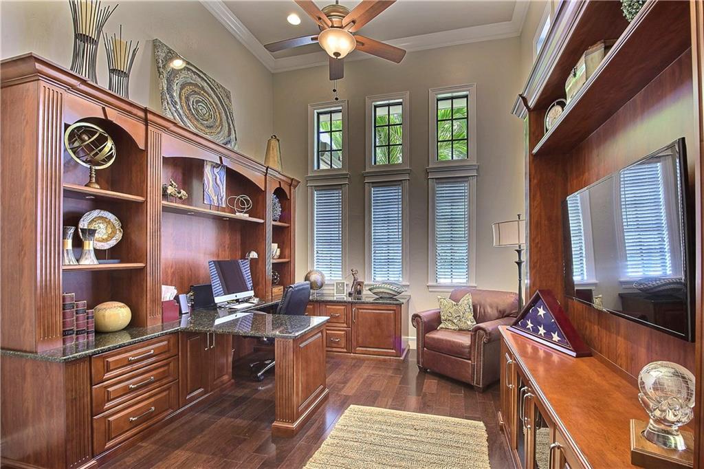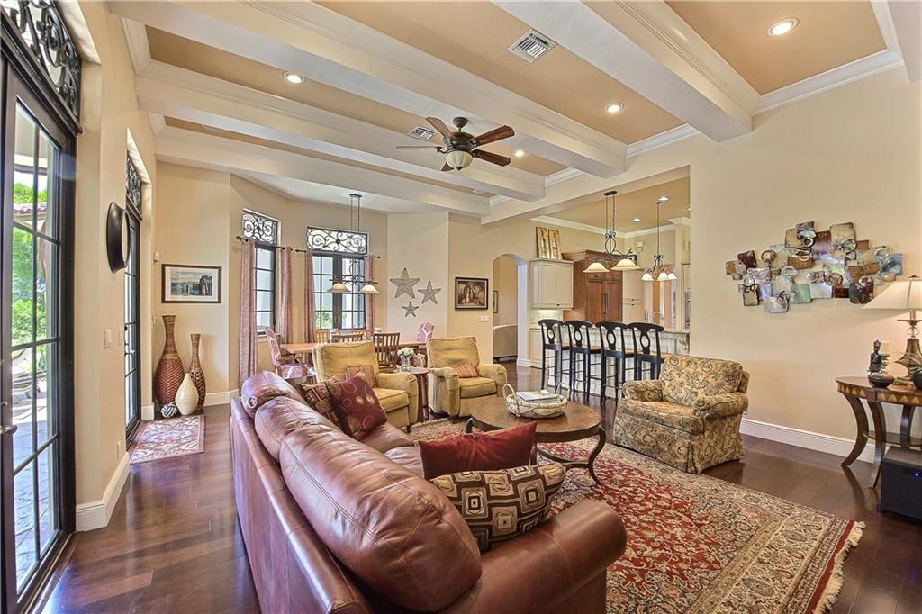 Offering choice golfcourse location, this .37 acre estate exudes elegance & quality craftsmanship! Outstanding features incl: coffered & beamed ceilings; exquisite millwork--crown, picture frame & chairrail moldings; stunning hardwood floors thru-out living area; impact Fr. doors & all windows; breathtaking & upgraded gourmet kitchen; private baths for each bedroom; custom built office; gorgeous master bedroom & bath; & resort-style pool & patio w/recessed screen, built-in outdoor kitchen & 5-star view!