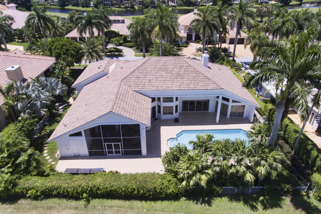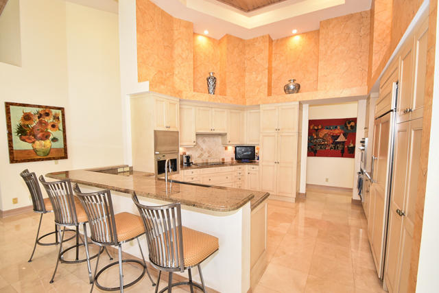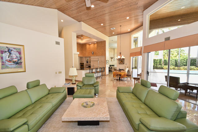 Beautiful Contemporary 5-bedroom + office one-story home on oversized lot with double fairway views. Newly painted inside & out, 2 new A/Cs, newly polished marble floors, new pool heater & pump, full-house video camera security, all LED lighting. Light & bright great room includes living room area complete with fireplace & wet bar plus a large dining room area. The kitchen, with Downsview cabinets, Viking gas cooktop & ovens, Sub-Zero refrigerator, Miele built-in coffee system, opens to family room. Master suite with dark wood floors & plantation shutters. Two of 4 guest bedrooms are ensuite & 1 has own entrance. Outside, lanai with outdoor kitchen has built-in BBQ & new dishwasher. Heated pool, tiled patio, full cabana bath with steam shower. Circular drive, 3-car garage, marble entryway.