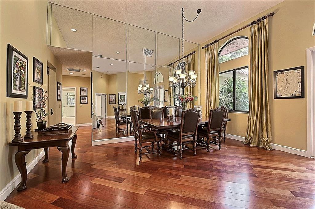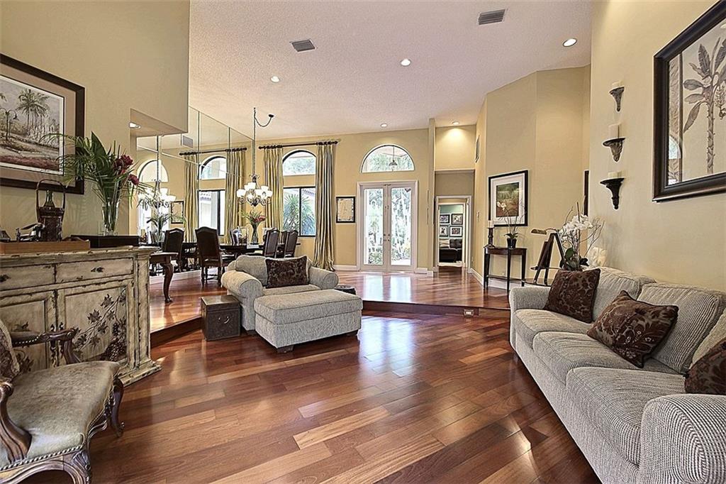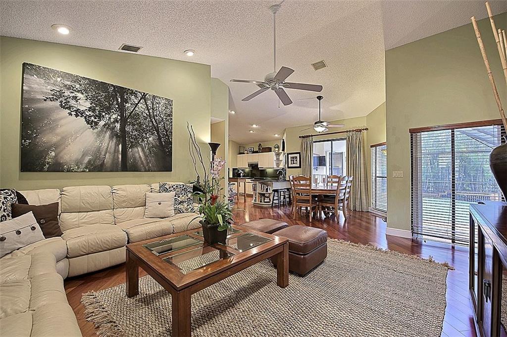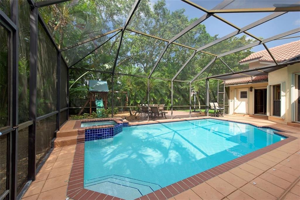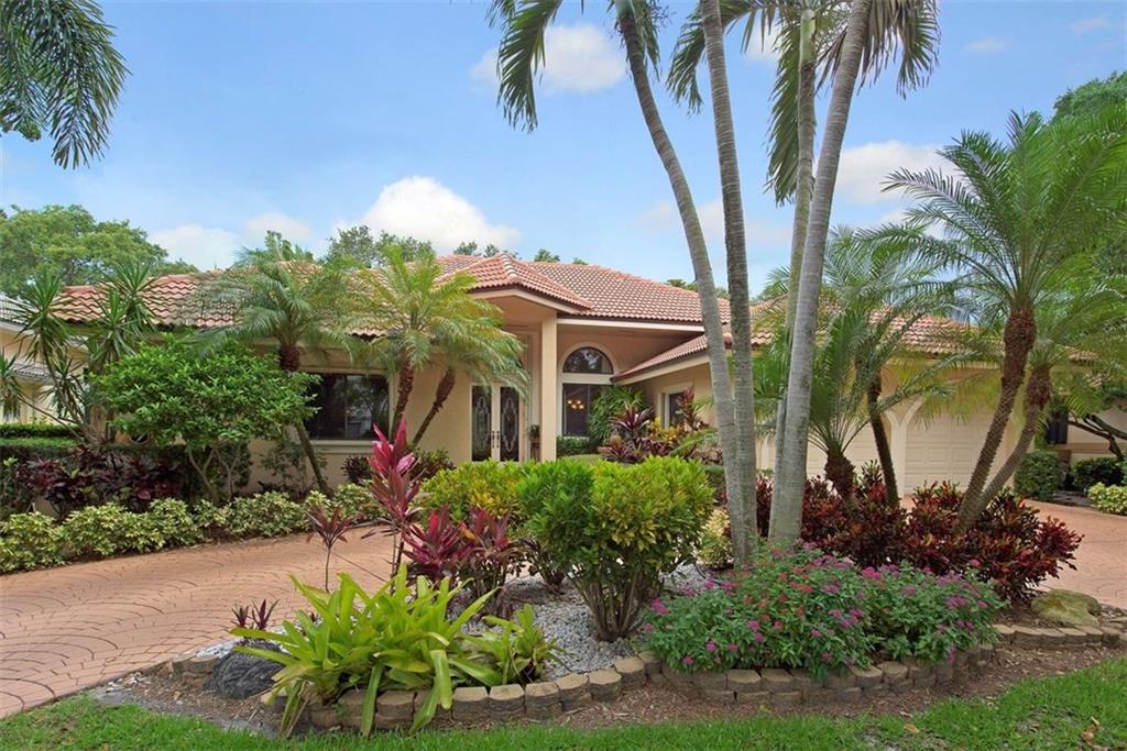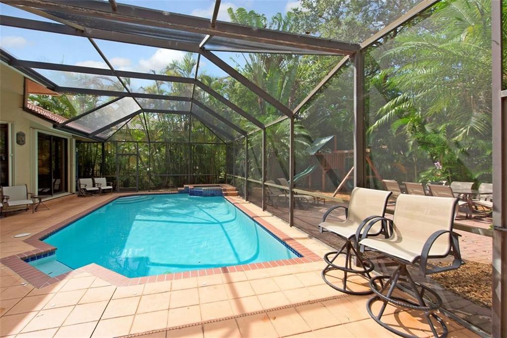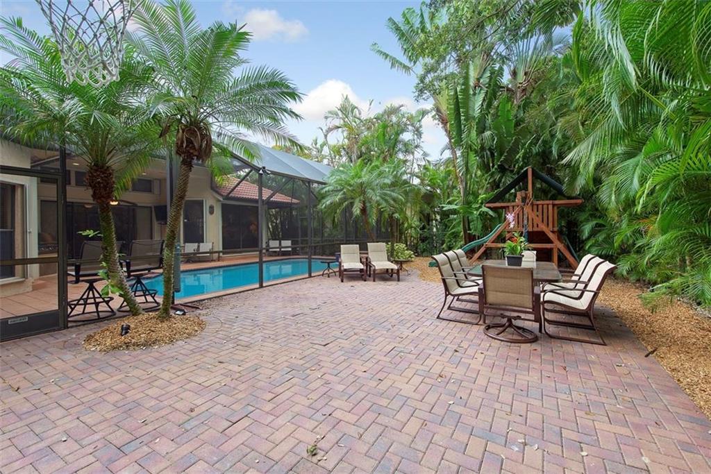 Tropical paradise on quiet park-like cul de sac. Contemporary architecture, high flat and cathedral ceilings with transom glass windows. Accordion hurricane shutters and newer 2006 roof. Two zone A/C and water heaters. Updated kitchen and baths. Gorgeous cheery wood floors throughout living areas. Large bedrooms in desirable split bedroom floor plan. Heated pool and spa, completely screened and fenced. Open playground, deck and built-in BBQ. Fabulous guard gated community with great amenities.