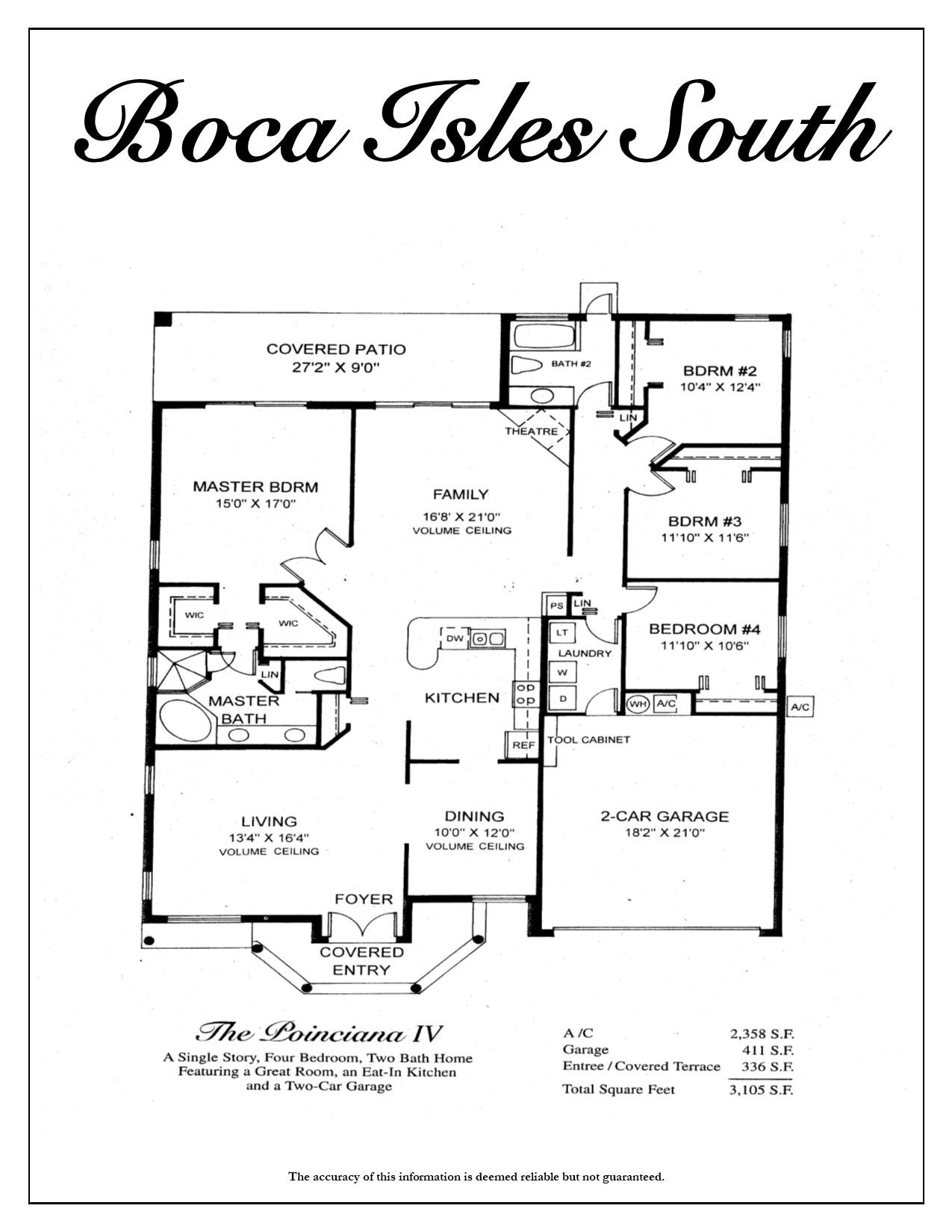 WELCOME TO BOCA ISLES SOUTH..THIS POPULAR POINCIANA 4 LOCATED ON A PRIME CORNER LOT IS PRICED TO SELL.WONDERFUL SPLIT FLOOR PLAN..OPEN AND AIRY.OVERSIZED SCREENED PAVER PATIO PLUS PLENTY OF ROOM TO PLAY.AIR CONDITIONING SYSTEM IS JUST A YEAR OLD.NEWER KITCHEN WITH STAINLESS STEEL APPLIANCES AND GRANITE COUNTER TOPS.GRAND MASTER SUITE WITH HIS AND HERS WALK IN CLOSETS WITH BUILT INS,NEW DOUBLE VANITY SINKS,SOAKING TUB AND SEPARATE SHOWER PLUS WATER CLOSET.TILE FLOORS IN THE MAIN LIVING AREA AND CARPET IN THE BEDROOMS.LARGE FAMILY ROOM AND BREAKFAST ROOM. SEPARATE WING WITH 3 ADDITIONAL BEDROOMS AND BATH.PLANTATION SHUTTERS IN THE LIVING ROOM AND DINING ROOM...FORMAL DINING ROOM HAS BEEN CONVERTED TO AN OFFICE BUT CAN EASILY BE CONVERTED BACK. BUYER TO PAY A $200 TRANSFER FEE TO BOCA ISLES