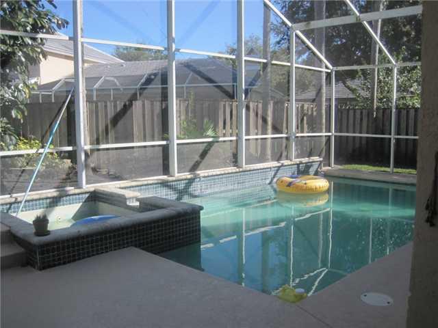 BEAUTIFUL 4 BEDROOM 2 AND A HALF BATHROOM, DOME SCREENED PATIO OVER POOL AND SPA. WHITE TILE ON FIRST FLOOR, PERGO WOOD FLOORING IN MASTER BEDROOM AND BATHROOM. WOOD KITCHEN CABINETS WITH GRANITE COUNTERTOPS. UPDATED SECONDARY BATHROOMS. NEWER APPLIANCES, NEWER ZONED A/C UNITS, ACCORDION SHUTTERS 2ND FLOOR, PANELS, 1ST. FRESHLY PAINTED INTERIOR & EXTERIOR.