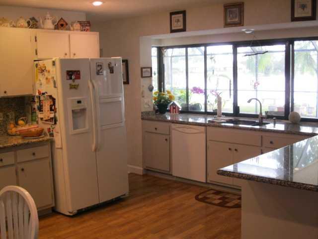 Pride of Ownership, Well Maintained home featuring dynamic scenic lake front property w/split bedrm plan, wood laminated floors, throughout except 3 bedrms. New carpeting in bedrms, Newer kitchen appliances w/granite counter top. Remodeled 2nd bathrm w/all newer fixtures, tile floors & walls. Covered screened Pool area w/magnificent lake view. Newer front door, french door & side door.