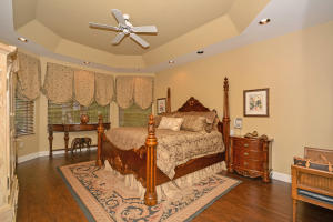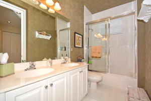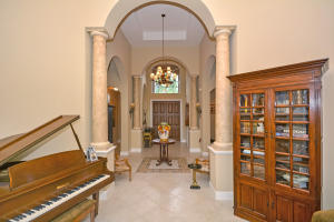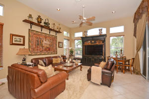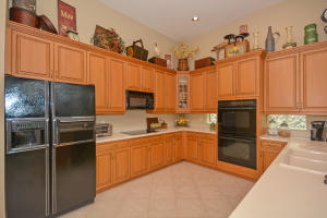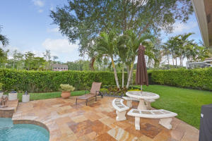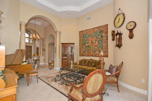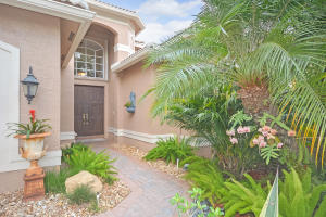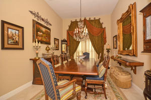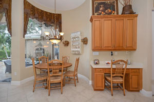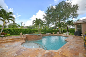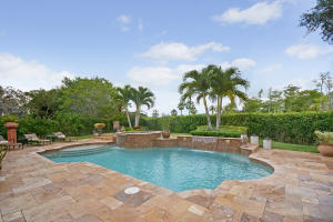 Beautifully appointed 4 bedroom 3 bath one-story home on south backing oversized private lot with trees beyond.Features include accordion hurricane shutters,tile on diagonal, tile design in gallery,''wood'' floors in all bedrooms,columns,art niches,French doors,custom window treatments,outfitted closets.The gourmet kitchen features glazed wood cabinetry with dentil molding,bump out at double oven,center island,desk area,snackbar and separate breakfast nook with rounded seamless window.The family room is open to the kitchen.The master suite features outfitted walk-in closets,a luxurious master bath and French doors to the covered patio.The backyard 'resort' has an oversized marble patio,heated salt water pool and spa with waterfall and huge grassy area with plenty of room for a swingset.