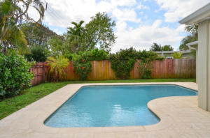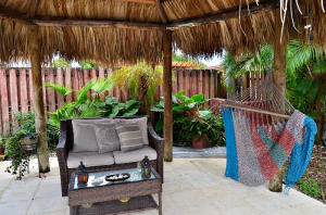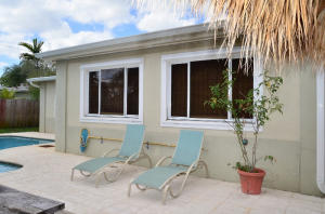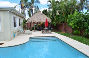 This is your new tropical oasis pool home,with 3 bedrooms & 2 baths both completely updated. Very modern open concept kitchen with double ovens, restaurant style glass front refrigerator,and a recessed copper sink. The flooring is a beautiful rich wood, and large travertine tiles. Outdoor dining/BBQ area and a newly thatched Tiki hut,gorgeous pool,and tons of foliage for year round resort style living. The roof and gutters were recently updated,and there are storm shutters. There is even a concrete slab to store your boat on the side of the house!