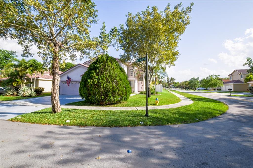 UPGRADED 4/3 Corner Lot with 3 car garages. Very well maintained. 1 bedroom & full bath downstairs. Separate Living Room, Formal Dining Room & Huge Family Room. Open style upgraded kitchen has breakfast area with big window. Big Master Bedroom has 2 close ts. Many upgrades, Accordion Shutters on all windows, Wood Blinds, New Kitchen Appliances and Air-conditioning unit. Upgraded bathrooms. New water filter in kitchen. Fenced backyard with new fence, has space for a pool. Freshly painted. Gated Community.