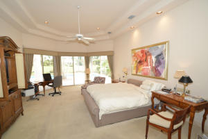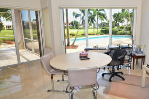 Beautiful one-story home in prime location with expansive lake and golf views. Situated on a quiet cul-de-sac street, this home features a Contemporary interior with clean lines, marble floors, lots of natural light, and an excellent floor plan that highlights the incredible views. Living room with wet bar; custom library/office with etched glass doors, master suite with exercise area, his & her baths, and generous closets. Kitchen opens to family room & breakfast area. All guest bedrooms are en-suite. Outdoors, a circular driveway, accordion hurricane shutters, a large screened-in lanai with Summer kitchen, sunny patios, large pool, and gorgeous lake and golf views.