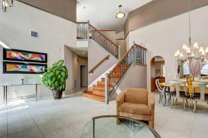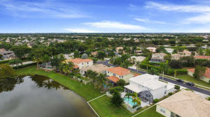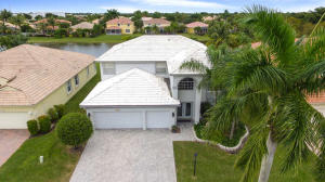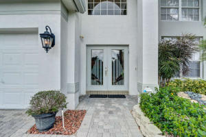 Lake front home, immaculately maintained by the original owners. High volume ceilings excite you as you enter the dramatic living area & see the elegant mahogany staircase.Designer kitchen w/custom wood cabinets,granite counters,center island,pantry, stainless appliances including LG french door refrigerator & warming drawer. Pretty powder room w/pedestal sink. Luxurious Master Suite downstairs w/recessed entry has crown molding,customized walk-in closet, volume ceiling,double vanity,soaking tub + separate shower. Upstairs are 3BR's,2 full baths + loft w/pool table + exercise (5thBR) room which can be easily enclosed w/closet.Portable generator. Screened porch + expanded pavered patio surrounds the pool.HOA incl.swim,fitness & tennis center,basic cable + manned security.''A'' rated schools