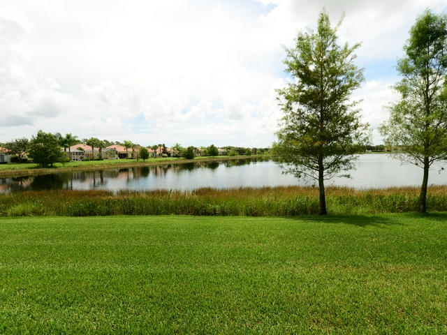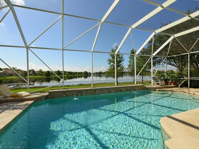 Fabulous, bright, sunny and spacious highly sought after Carlyle floor plan with beautiful upgrades located on the long lake view enjoying a southern exposure! Lots of custom upgrades, including a magnificent cherrywood built-in entertainment unit in the family room and den/4th bedroom, granite countertops, glass cabinets, crown molding, chair rails, beautiful wood flooring, new 2011 A/C and handler, custom shades and an expansive screened loggia with shelving. Accordion shutters throughout and tinted windows make this a safe and economical home. Enjoy spectacular lake views from the oversized, screened patio with custom oversized pool featuring a pool table for tropical drinks!