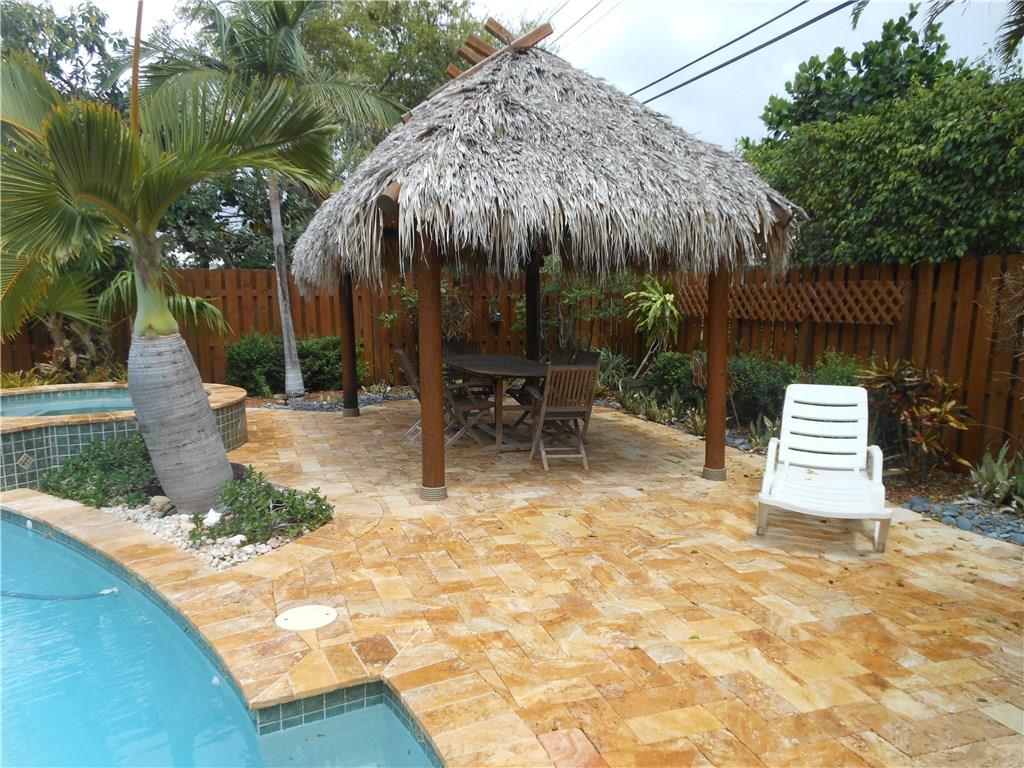 Resort Living-4/3 split plan, family room, heated pool/hot tub, laundry rm with storage, 2 car garage. Features: Impact windows/doors, remodeled kitchen opens to family room and dining area with granite, SS appliances, double sinks, pantry and breakfast bar, 3 updated baths, tile floors throughout. Tropical Paradise highlights a thatched palm tiki hut for outdoor dining, salt system pool/hot tub, travertine pavers, Kitchler Landscape Lighting. Sophisticated Lutron remote controlled lighting system.