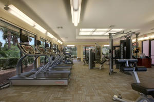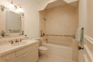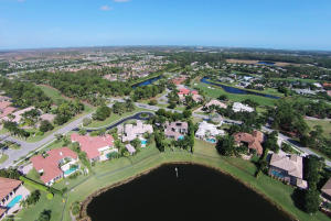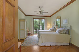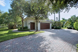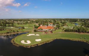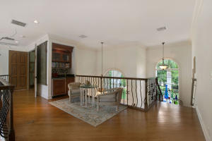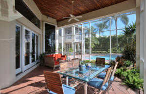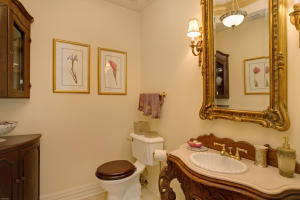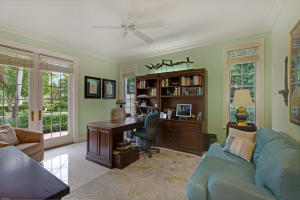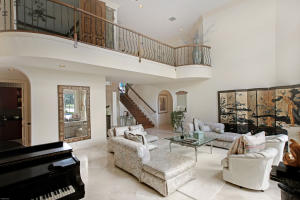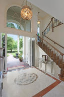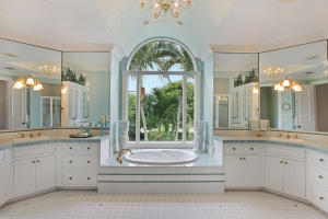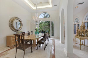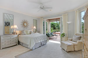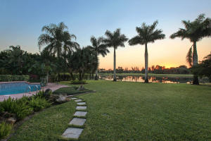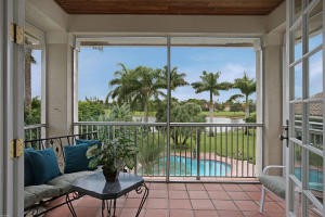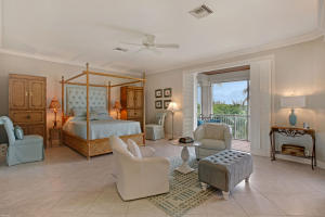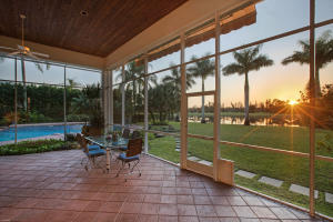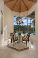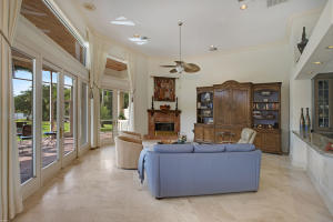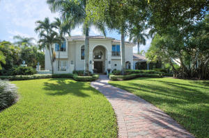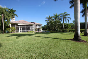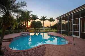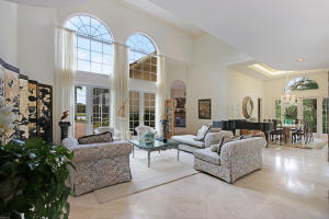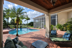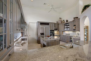 Stately Mediterranean home on prime .70 acre lake and golf course lot in gated community of Breakers West in West Palm Beach. Located on cul-de-sac, this spacious 4 BR, 4.5 BA home with almost 4,700 A/C living area has classic, clean details such as saturnia marble flooring, French doors and crown molding. Elegant dining room with coffered ceilings has French doors opening to charming outdoor garden and patio. Gourmet kitchen with contemporary granite counters, 48'' built-in refrig, double ovens and large center island. Breakfast area has octagonal cypress wood ceiling. Family room with fireplace and French doors open to screened loggia and built-in grill area. Two spacious guest bedrooms downstairs each have private baths and lovely pool and garden views. Master suite and
