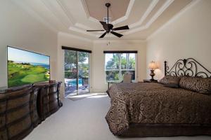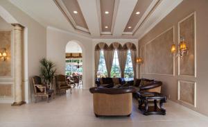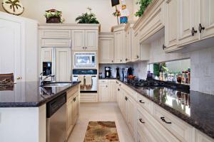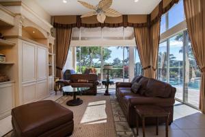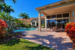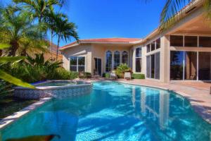 Splendid and spacious 3 bedrooms, 3.5 bath Florida architectural home with office/den has everything an entertaining family would enjoy. The double glass door entry opens to the spacious formal living room with crown molding, lighted niches and coffered ceilings. Well-appointed dining room features coffered ceiling, and elegant details. Family room features windows galore, and custom built-ins. Open to the family room, the gourmet kitchen offers granite countertops, upgraded wood cabinetry, pull out drawers, built-in ovens and spacious center island. The master suite offers dual closets; master bathroom includes double vanities, granite countertops, and Roman tub. Lush outdoor landscaping surrounds the custom heated pool and spa. Covered loggia is perfect for entertaining.