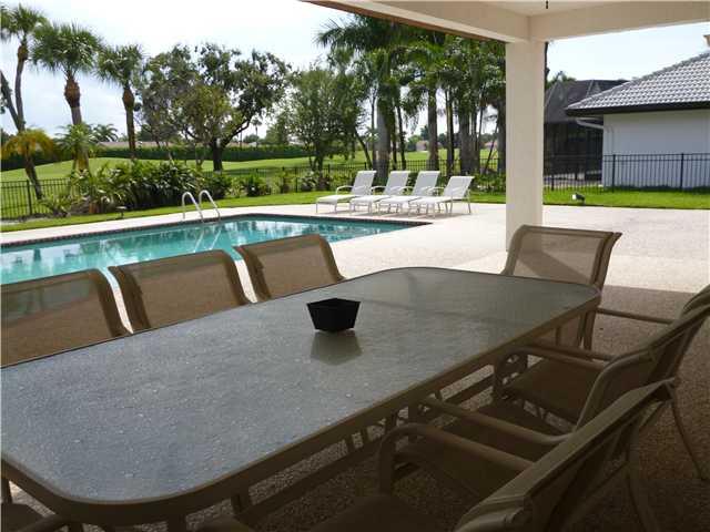 Contemporary 4/4.5 pool home with expansive golf view of Bocaire CC.Open floor plan with volume ceilings & great views. Gourmet kitchen w/high end appliances incl Wolf gas range, Sub-zero refrigerator, Miele dishwasher, Elmwood cabinets & Brazilian granit e counter tops. Great room w/ automatic window treatments. Master w/ His & Hers closets/baths. Patio has built in Lynx grill center and power awning. On 11th fairway! Golf cart included!! Manned security gate. Mandatory club membership.