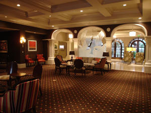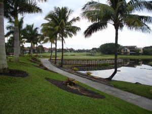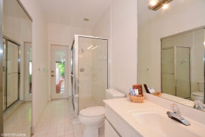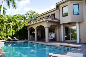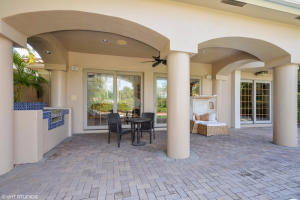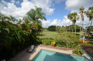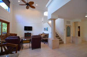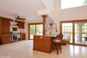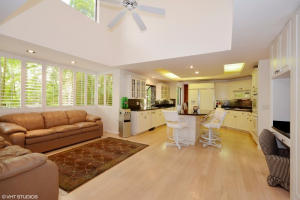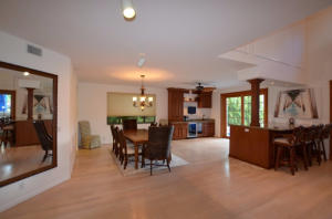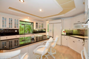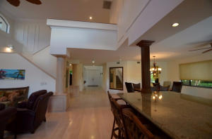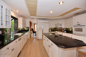 Beautifully renovated and bright home with both golf and lake views. Amazing value! Stone and wood flooring throughout living area. Newer roof. Spacious gourmet kitchen with center island and granite counters is open to a cozy family room. The two story living room has detailed wall and crown moldings. Formal dining area plus an additional entertaining area featuring custom wood built-in cabinets, a wet-bar and refrigerator. Large first floor bedroom and cabana bath could serve as a master bedroom or guest quarters. Front windows are hurricane resistant.