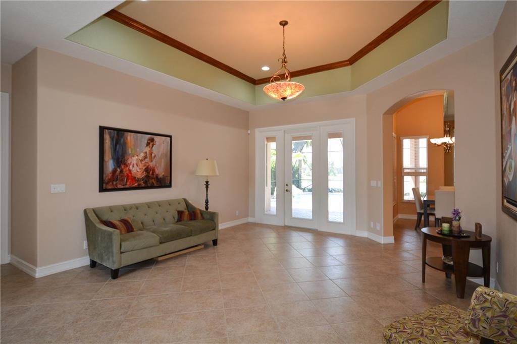4 bedroom, 3 bath + office in The Vistas with pool & water! Beautiful foyer, living room with french doors that open up to the oversized patio, heated pool & screen enclosure with fabulous water views! Huge family room w/stunning windows that overlook the patio & more water views! Huge kitchen with new stainless steel appliances & grantie countertops. Crown moldings. Tile & wood flooring thru-out. Circular driveway, 3 car garage, Accordion shutters. Bus service to Heron Heights and Park Trails.