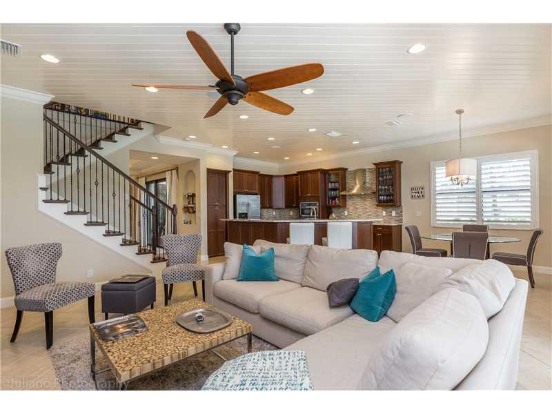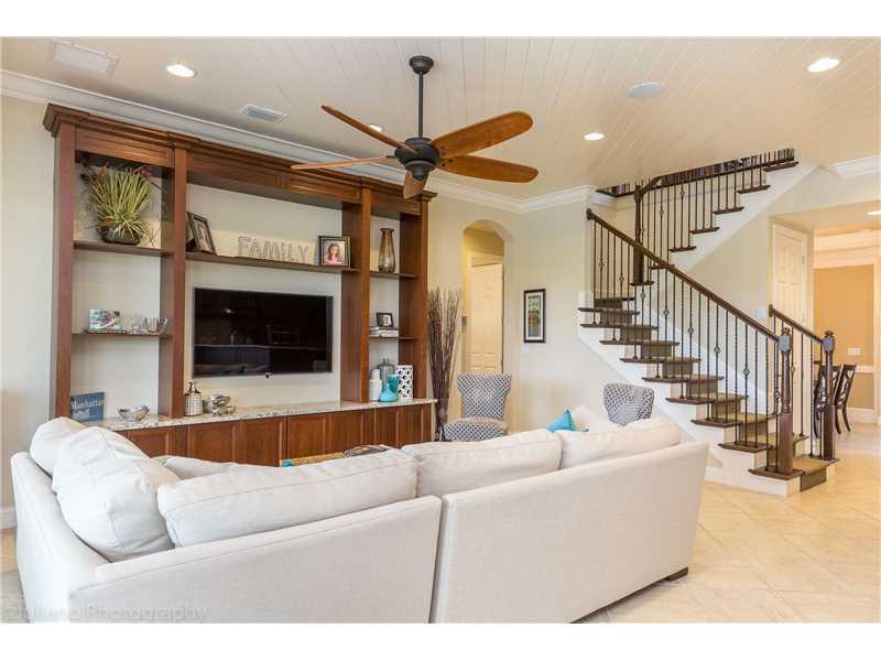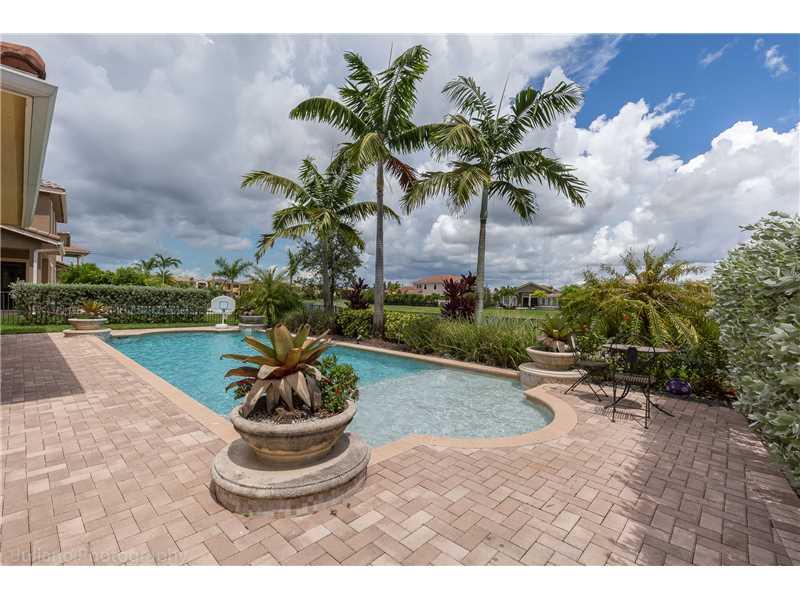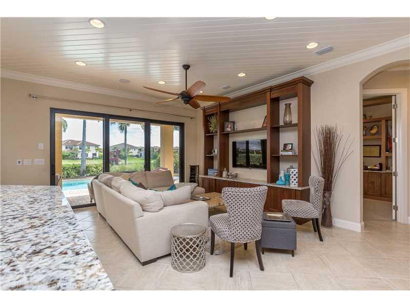 STUNNING FORMER MODEL HOME WITH OVER $200K IN BUILDER UPGRADES. These upgrades include coffered ceilings, crown molding, built in cabinetry, Plantation shutters, marble and wood flooring. Gourmet kitchen with granite counters and tile back splash with sta inless steel appliances and wood cabinets. Perfect entertaining home with kitchen and family room overlooking pool, patio and serene water view. Spacious master suite with double door entry. Lush tropical landscaping with outdoor kitchen for entertaining