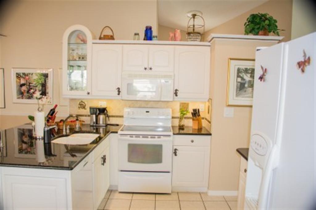 Gorgeous, well kept Buckingham model. Upgraded, reconfigured kitchen with granite countertops and cabinetry. Bathrooms have new granite vanities, lighting and 2nd bath has new toilet and tub. 4 ton York Affinity A/C. Hurricane accordion shutters on sliding glass doors (2). Hurricane panels for all windows and garage. Utility sink and extra cabinets in garage. Enclosed screened in tiled porch (8' x 25') with insulated roof. Perfect for rainy days.Lush landscaping with tropical plants.