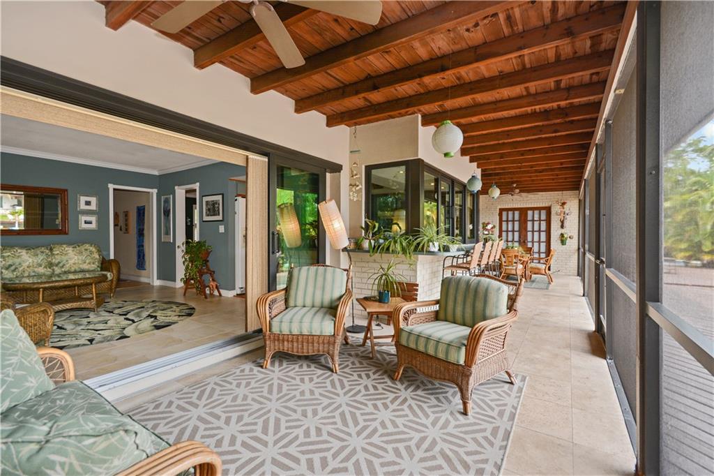 Relaxing 2763sf island style 3BR/2BA/2CG pool home offers 130' of wide river waterfront views positioned at the end of a quiet cul-de-sac. Inside features large living, dining and family rooms, custom office (3rd BR), impact windows/doors and customized kitchen with pass thru. Outside boasts a large lanai with additional living and dining areas, huge deck, private pool/spa and boatlift, perfect for entertaining. Gated neighborhood, great location, only seconds to shopping, dining and minutes to the beach.