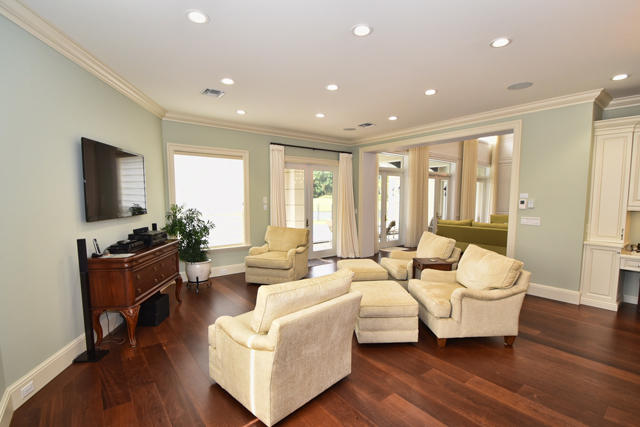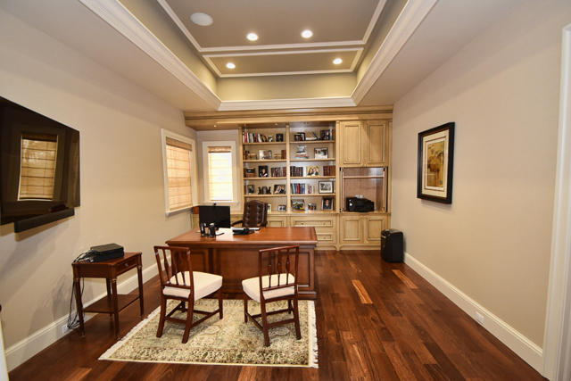 MAJOR PRICE REDUCTION! Sold TURNKEY! Built in 2011 with extraordinary attention to detail & exquisite high-end finishes, this elegant, Contemporary two-story, 4-bedroom + office home was designed to highlight the expansive lake & 5 fairway golf course views. Marble and wide-plank wood floors, architectural moldings, tray ceilings, French doors, HURRICANE GLASS, energy-efficient LED lighting, high-end plumbing fixtures, motorized shades, sound system, and more, grace the interior. The double door entry with an adjacent sitting room leads to a spacious living room and dining room which features beautiful, hand-crafted built-in cabinetry. The living room and dining room flow easily into the family room and kitchen, and all the rooms provide beautiful views of the lake and golf