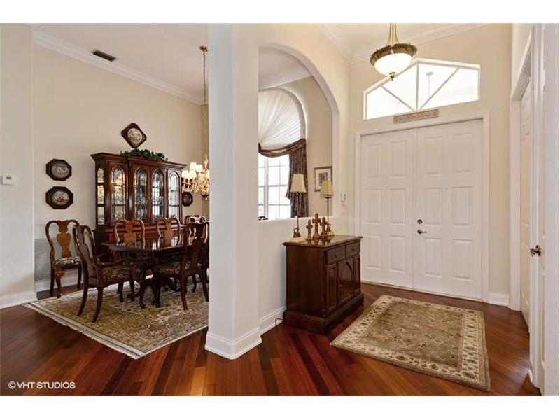 Beautiful Waterfront home w/ custom floor plan, warm Cherry wood floors & many upgrades. Spacious split Bedrooms, one with custom murals, 3 neutral bathrooms, Office w/ custom built-ins. Model kitchen with granite, 42" custom cabinets, HUGE 6.7x5.5 pantry , S/S Bosch/GEProfile appl. new A/C, Architectural details of trey ceilings, crown molding, arches, plant shelves, French doors, etc... Outdoor paradise w/ Summer Kitchen,ref/bbq,waterfall, DB pool, Jerusalem marble deck, TV, shutters & water/sunset view