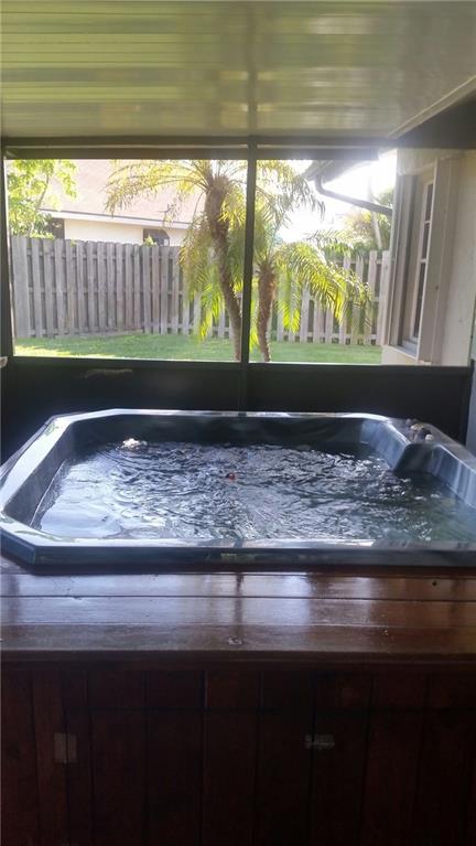 Beautiful split 3 bedroom 2 bath home, large family room, living room, dining room, breakfast area with sliding glass doors to large covered patio with hot tub seats 6, 1 car garage,. House sits on oversized lot surrounded with shadow box fence w/2 gates. French refrigerator with ice/water on outside door, dishwasher, glass top stove, ceramic tile throughout, ceiling fans, central A/C, washer/dryer, automatic timer sprinkler system, shed, accordion hurricane shutters, motion sensor outside lighting.