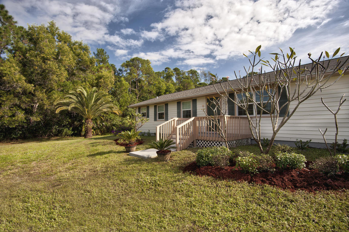 This light and bright, charming 3/2 with oversized 2 car garage on huge 1+ acre lot is located on a quiet street. This lovely home has a canal all along the east side of the lot that provides plenty of privacy. There is a delightful pond in front. This wonderful home features two decks, one at the front entry and in back, overlooking the large yard. The living area has a vaulted ceiling, tile floors and french doors leading to the outside entertainment area. The kitchen opens to the sunny dining room. The master suite is generously sized. New composite decks in 2015. Fresh paint. New roof 2005. Lush landscaping. Room for pool and/or extra building. Own your own piece of paradise today!