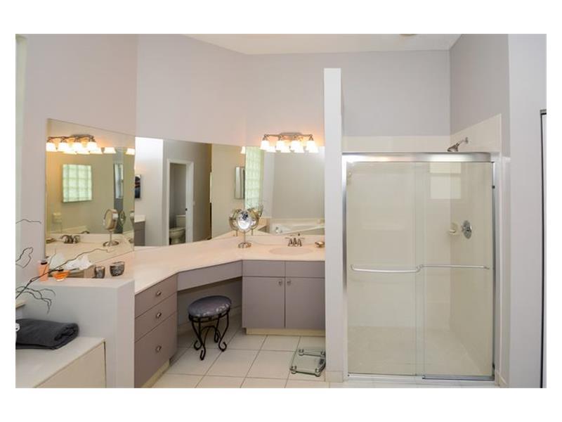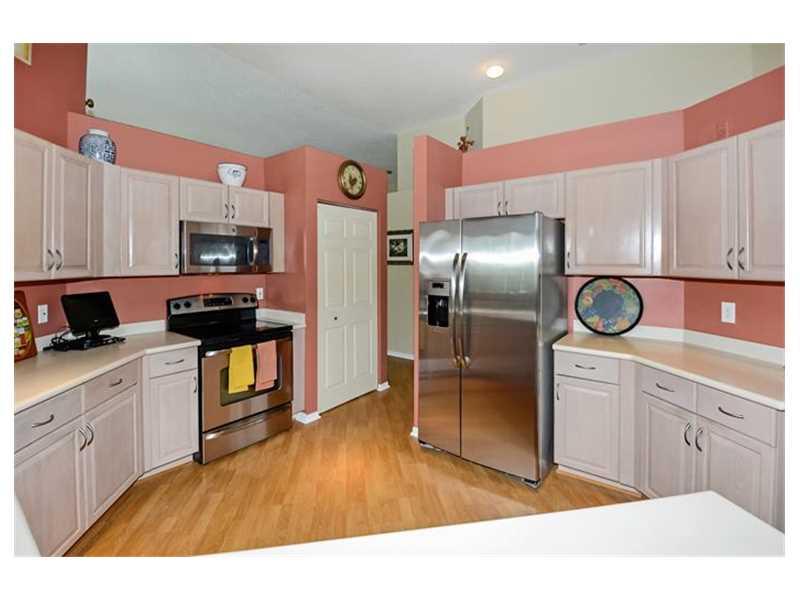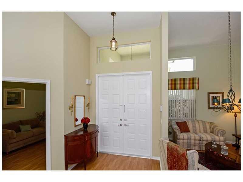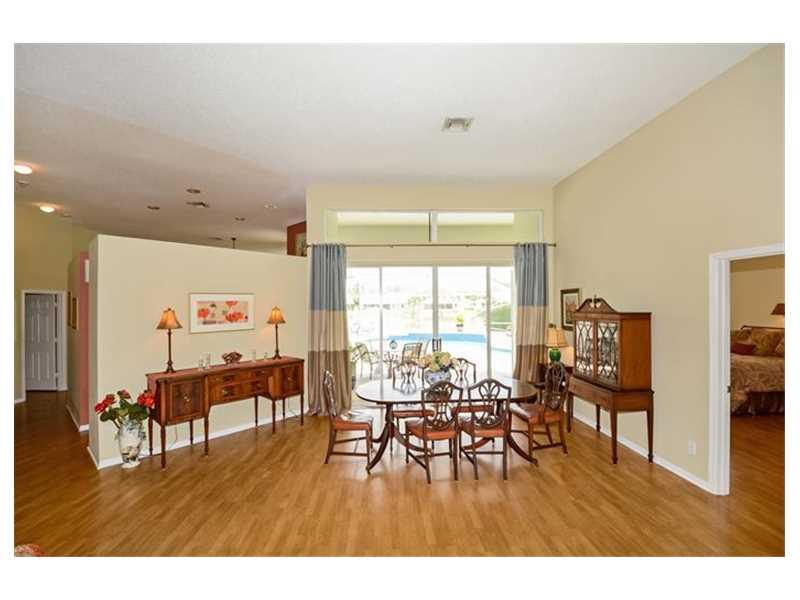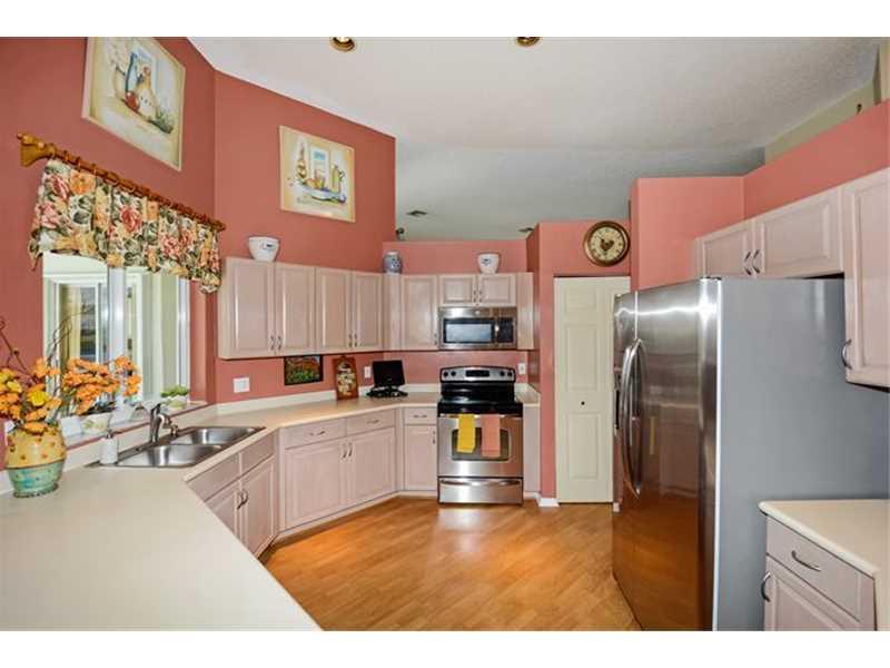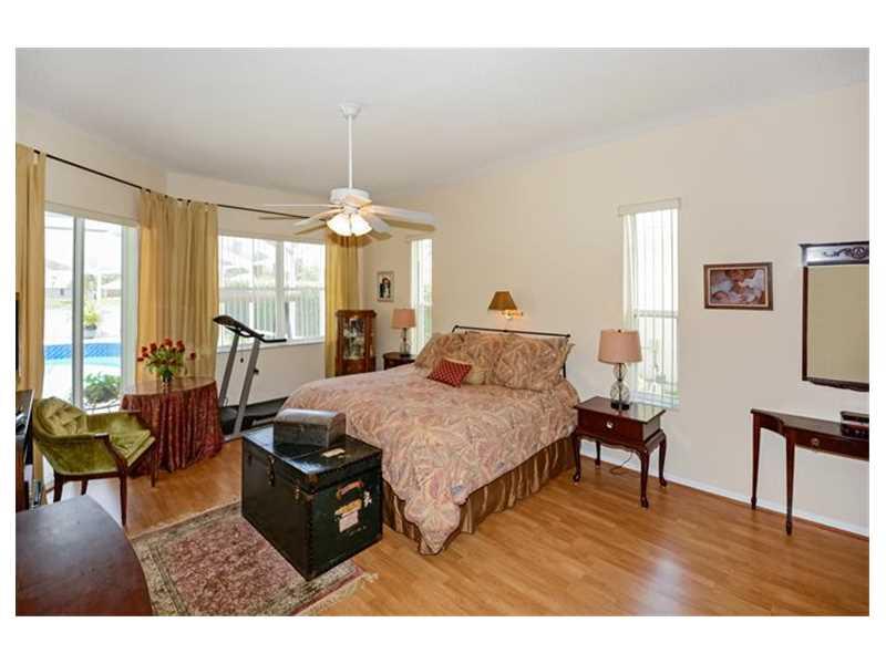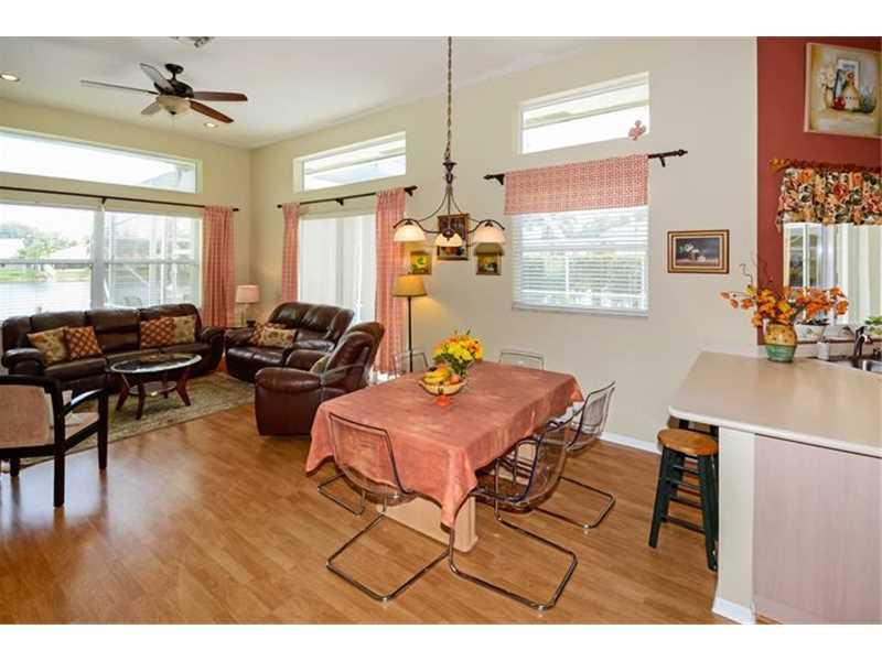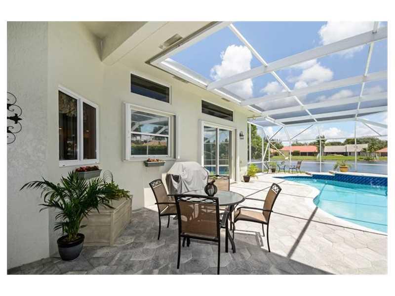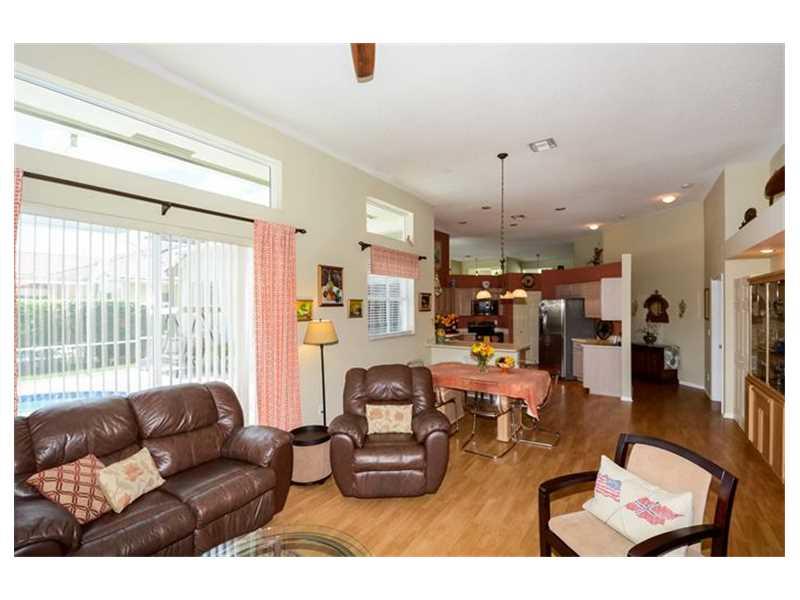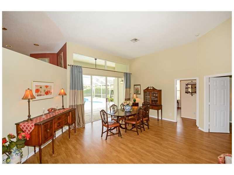 Beautifully maintained home w/huge dome screen, pool & amazing views of lake from all living areas & master suite. 3 way split floorplan, 12 ft. volume ceilings in living areas, kitchen w/corion counters, newer stainless appliances & opens to huge familyr m, master suite w/sitting area, his & hers closets, master bath, roman tub, stall shower, separate vanities. Laminate flooring throughout, accordion hurricane shutters & impact transom windows. Grand double door entry opens to amazing view of lake. No HOA