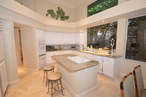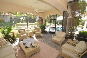 This fabulous 5-bedroom + office home is situated on a beautiful oversized lot. The interior features an open floor plan, marble floors, crown moldings, neutral colors, and lots of natural light. The master suite, along with 2 guest bedrooms, are on the ground floor, and 2 en-suite bedrooms are upstairs. The large, bright, updated kitchen has granite countertops and opens to the breakfast area and family room. Extra-large windows extend along the kitchen and breakfast area, providing verdant views. A large screened-in patio adjoins the family room and complements the lushly landscaped pool, patio, and lawn areas that offer a Southern exposure, privacy, and beautiful expansive water and golf views.