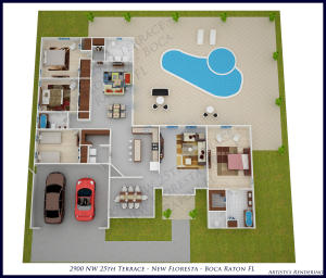 Just Renovated in New Floresta!!! Mediterranean style home with four bedrooms, three baths, and oversize patio with pool and spa. Brand new kitchen with stainless appliances, white shaker cabinets, and quartz counters, contracting island features a waterfall edge. Master suite with updated bathroom and closet with full built-ins. Separate living, dining and family rooms, all with pool views. Fully fenced yard, with covered outdoor dining area, cabana bath and more. Vaulted ceilings, new fireplace, wood and tile floors throughout. Impact windows, tile roof, and fresh landscaping complete the package. Convenient to central Boca, Town Center Mall, Parks, Beaches and more! Calusa Elementary, Omni Middle, Spanish River High - More Photos Coming Soon! -
