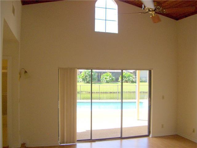 Welcome to this one of a kind mediterranean style waterfront pool home. Enjoy and entertain under the large southern exposure covered pool deck area with access from the two cabana baths, family room,breakfast area and master bedroom. Relax in front of th e floor to ceiling stone fireplace and under the volume planked wood ceiling. For your comfort the room sizes are large and closets more than ample. There are no HOA fees here in Cypress Glen.Very close to shopping,parks and recreation.
