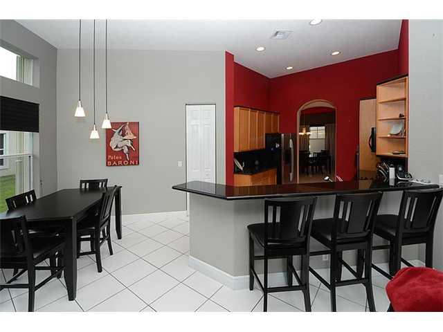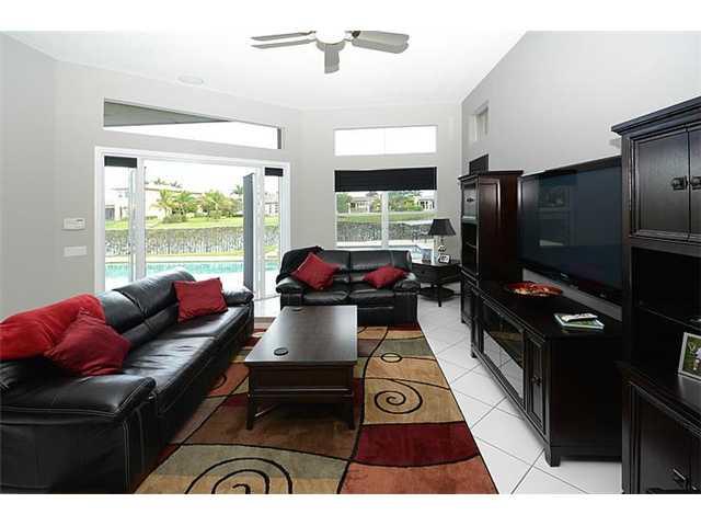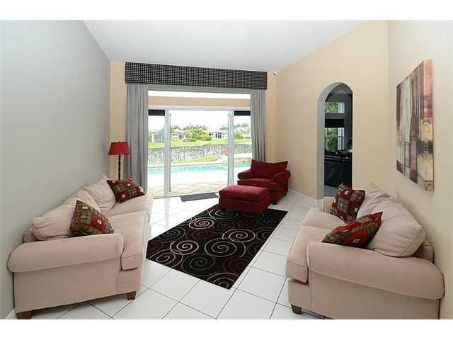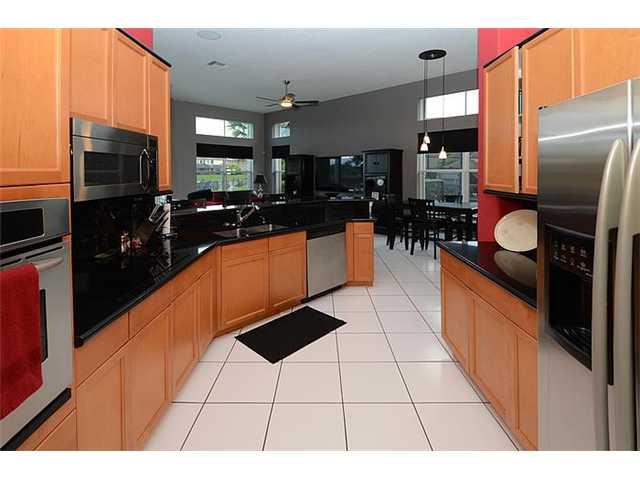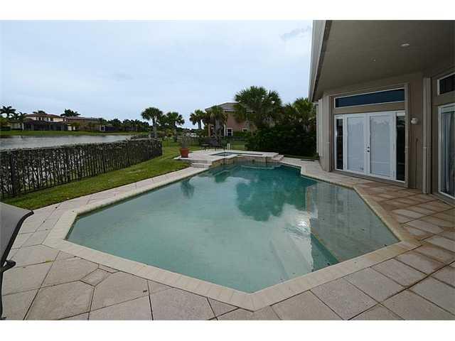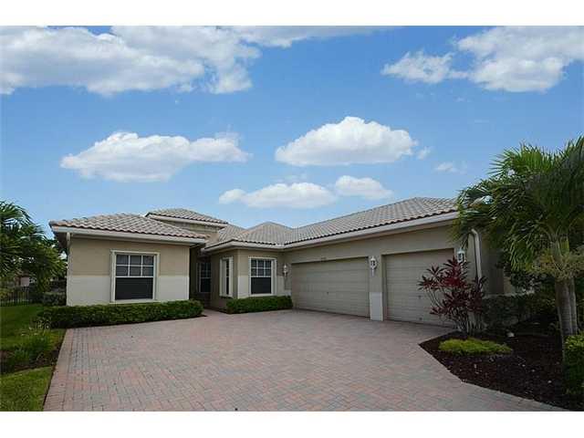 WOW- GREAT PRICE. Elegant 5 Bed, 3 Bath, 3 Car, pool home on oversized waterfront lot overlooking stunning golf course vistas. Upgraded eat-in kitchen includes 42" wood cabinets, granite tops, & wall oven. High ceilings throughout. Triple split layout wit h huge master suite featuring sitting area & walk-in closets. Upgrades: Large pool w/spa, fenced yard, full accordion hurricane shutters & security system with cameras. Guard Gated, extensive club house with resort amenities! All top rated schools