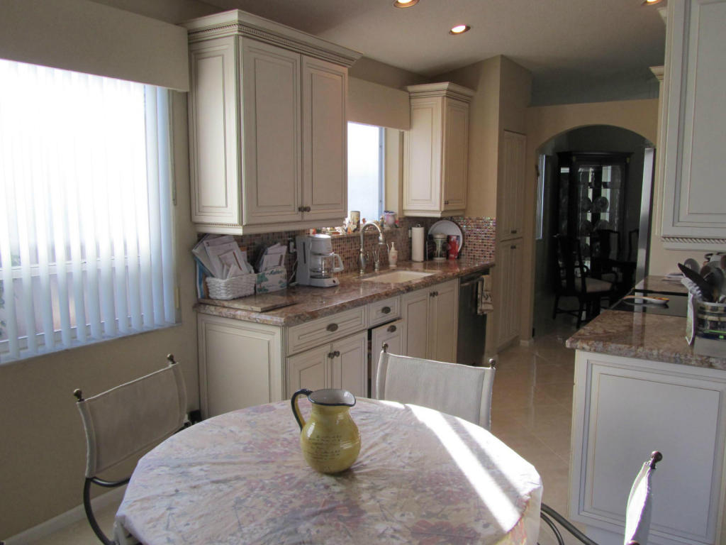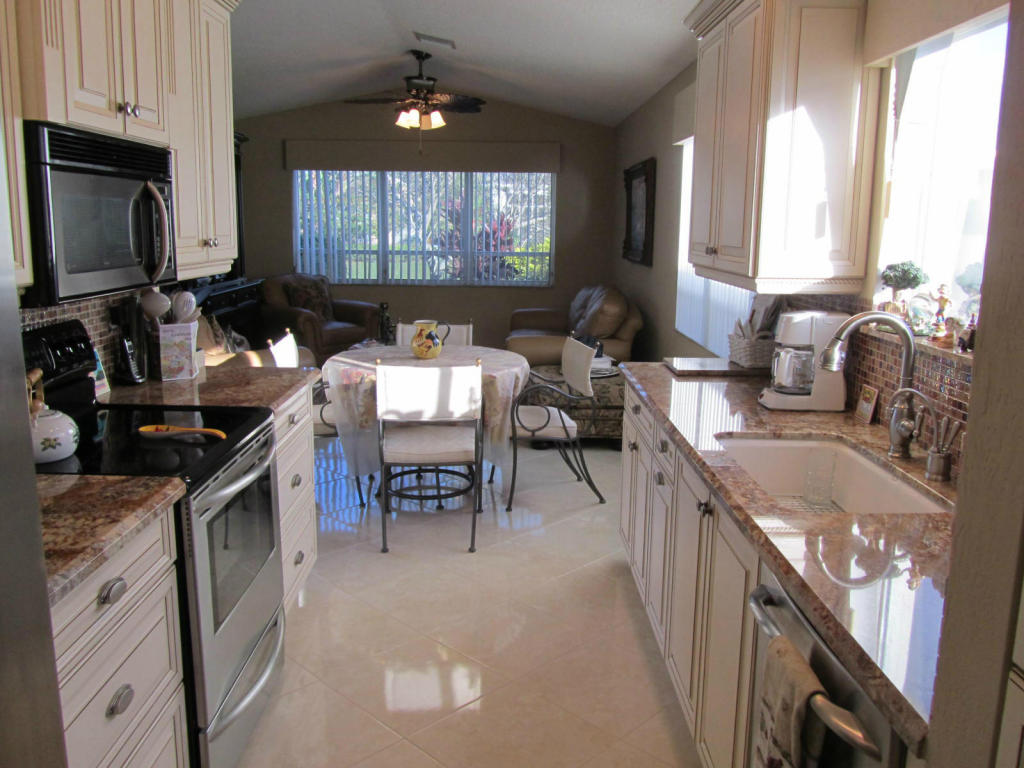 Gorgeous one story pool home in popular Palms community. No detail left undone. Floor plan features a living room plus family room and over sized 3rd bedroom. Home is situated on a serene lake view with a heated pool in the very private backyard. The roof and A/C have been replaced. The kitchen has custom light wood cabinets, granite counters, glass mosaic back splash and stainless steel appliances. Both bathrooms have been updated with dark wood cabinets, marble counters and replaced toilets. The master bath has a seamless shower door and large tile with decorative border, high wood cabinet with drawers plus a framed mirror over sinks and tub. Master bedroom has custom carpet, beautiful view of pool and a large walk in closet with custom wood built ins with many shelves.