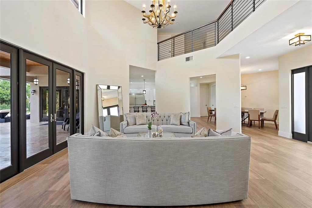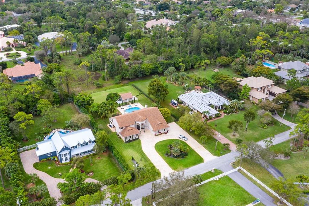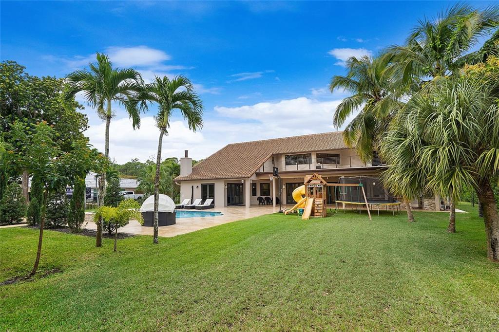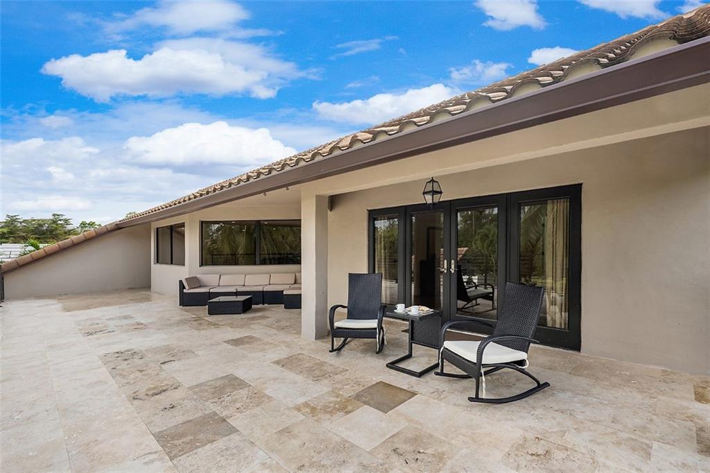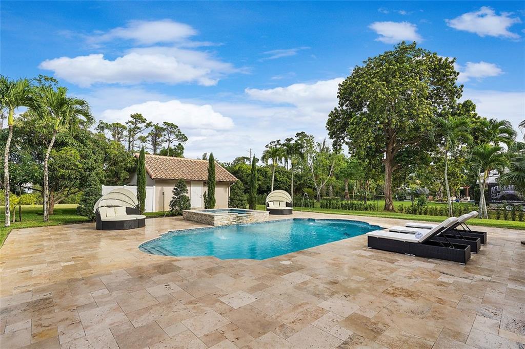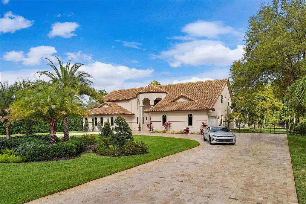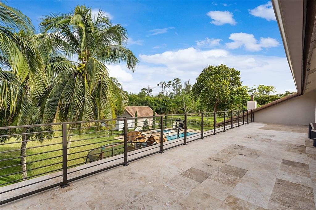 This magnificent home boasts an open and elegant floor plan. Upon entry you will appreciate the Italian porcelain floors and sophisticated design allowing views of the pool and garden. The home features a formal living and formal dining room. The expansive gourmet kitchen is a chef's dream with dual ovens, sub zero refrigerator and enormous island with seating for 6. Wine lover's closet. Oversized family room complete with fireplace. Downstairs features 4 bedrooms. Upstairs is the master and luxurious spa like master bath with walk in shower. Master features French doors that flow on to oversized balcony overlooking your outdoor paradise. Two other bedrooms and loft are are upstairs. The covered patio and summer kitchen are perfect for entertaining and flow to the tropical pool