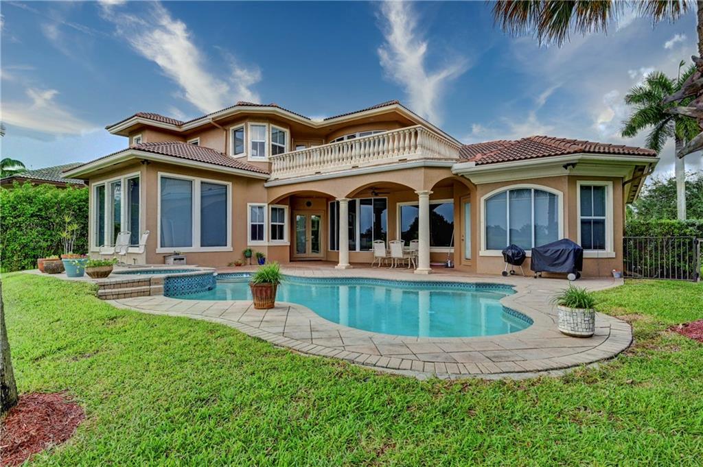 CUSTOM BEAUTY! MAGNIFICENT POOL HOME ON LARGE WATER LOT W/ BEAUTIFUL VIEWS! 5/5 W/ 3 CAR GARAGE AND HUGE CIRCULAR DRIVEWAY. OPEN LAYOUT HIGH CEILINGS THROUGHOUT! LARGE PICTURESQUE WINDOWS OFFER LOTS OF LIGHT W VIEWS FROM EVERY ROOM. HUGE LIVING ROOM, DINING ROOM AND FAMILY ROOM. GRANITE & WOOD CABINETS AND SEPARATE BREAKFAST AREA. LARGE MASTER BEDROOM AND MASTER BATH. ALL BEDROOMS HAVE CUSTOM CLOSETS. SPIRAL STAIRCASE TO THE 2ND LEVEL WHERE THERE ARE 2 FULL BEDROOMS AND 2 BATHS + A CRAFT/LOFT AREA. WALK OUT TO YOUR OVER-SIZED MARBLE BALCONY FOR THE GORGEOUS SUNRISE OR EVE GLASS OF WINE WHERE YOU WILL HAVE VIEWS OF THE POOL AREA AND GOLF COURSE. PRIDE OF OWNERSHIP AND WELL MAINTAINED. NEWER AC'S AND WATER HEATER, GREAT LOT IN A SMALLER CUSTOM COMMUNITY. A RATED SCHOOLS! CLOSE TO IT ALL!