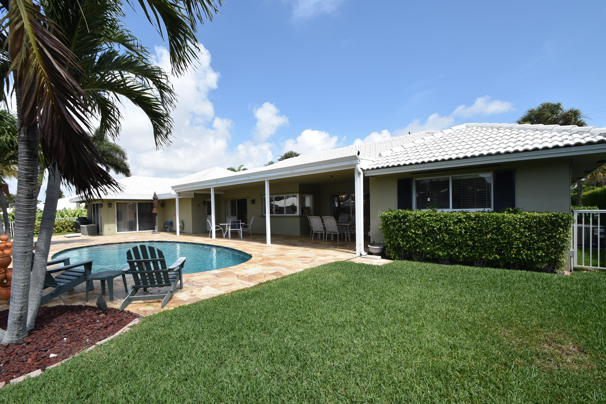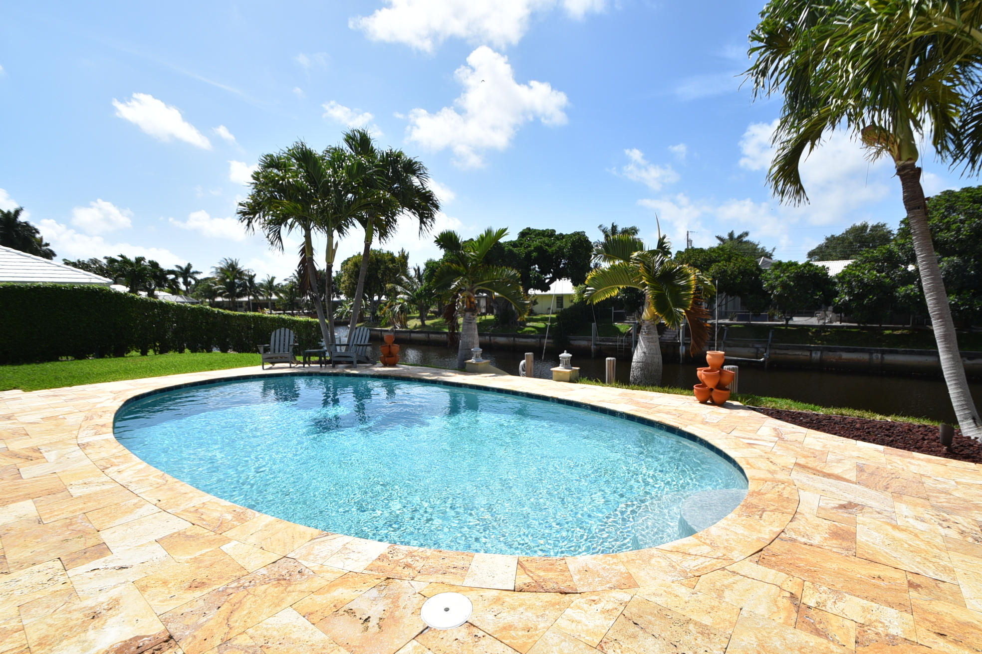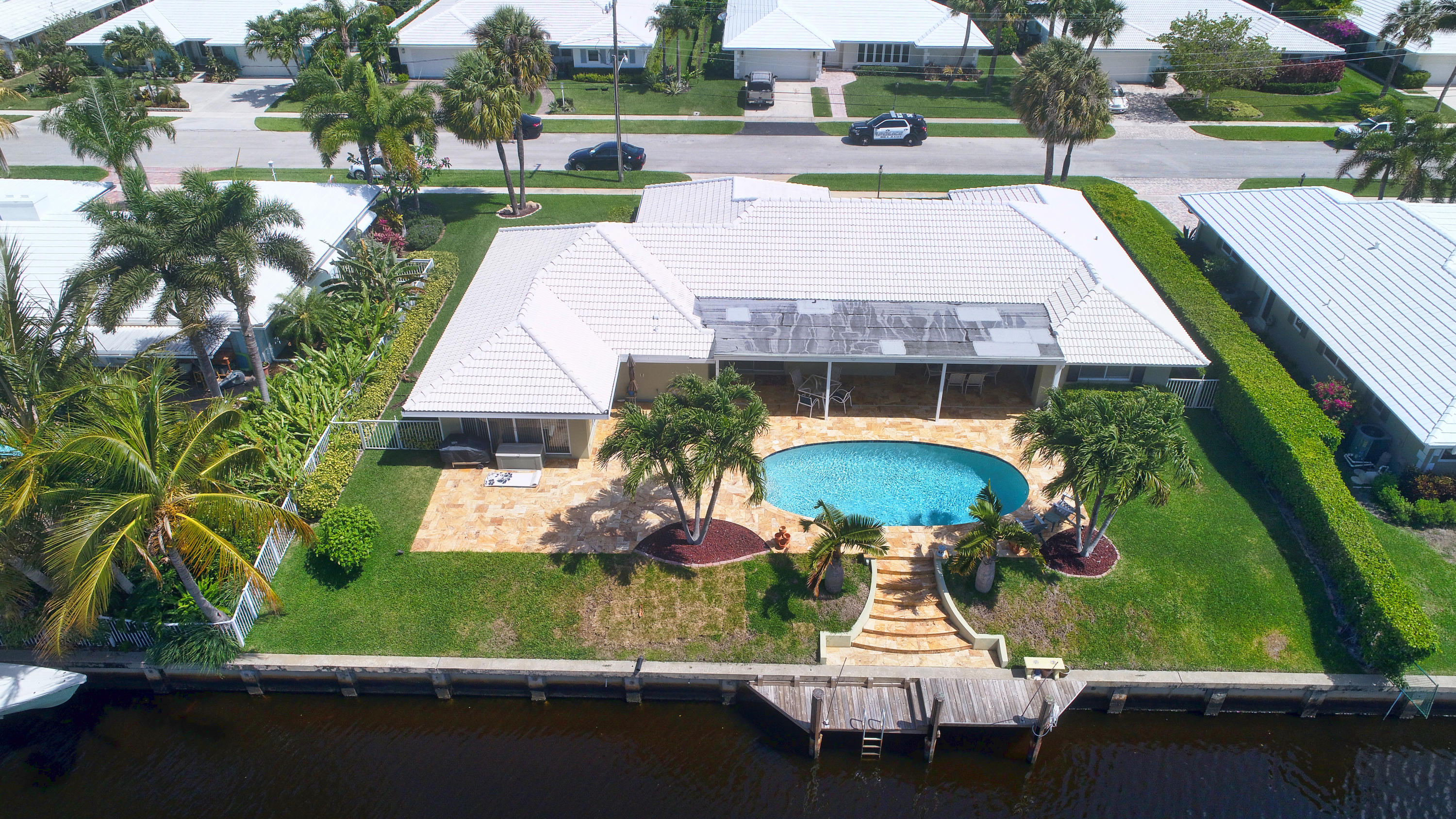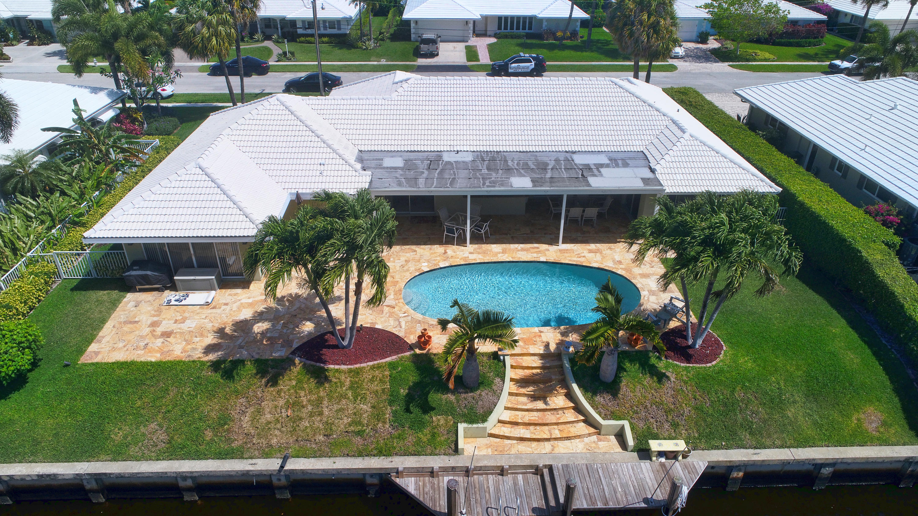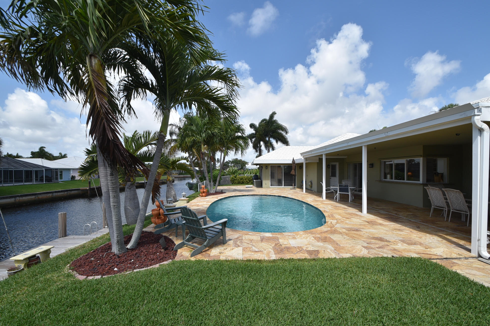 SPECTACULAR 3 bedroom,4 bath home on the El Rio Canal in the desired subdivision of Camino Gardens-VERY light,bright and airy-OVERSIZED lot-intracoastal and ocean access-two a/c units and boat dock only 6 months old-gorgeous 20'' porcelain tile on a diagonal in all the bedrooms-upgraded kitchen with granite countertops and solid wood cabinets-this home has BOTH a livingroom AND a family room-2 master suites-one of the largest homes in Camino Gardens with close to 2700 a/c square feet-south exposure on the pool-huge rooms-only 1.5 miles from the ocean-extremely LOW HOA fees of only $25 monthly-amazing travertine marble on the walkway and on the patio-the family rooms opens to the patio and pool which is perfect for entertaining-the best A rated schools-this stunning home won't last long