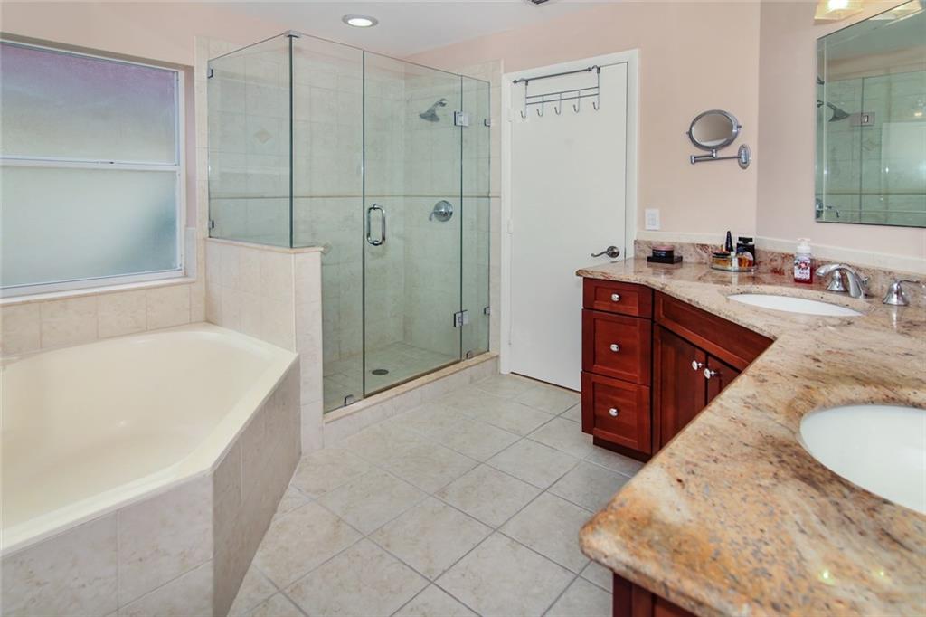 Beautifully maintained 4/2.5 home on oversized corner lot in Oak Park section of Forest Ridge! Large kitchen w/breakfast area & family room great for entertaining. Master bed on the 1st floor features updated laminate flooring & walk in closet w/French doors leading to the patio.Master bath has double vanity w/wood cabinetry,granite tops,soaking tub & shower w/frameless enclosure.Large beds upstairs.Knockdown ceiling texture.Screened in patio area w/huge yard steps away from the community pool.Roof 2006.