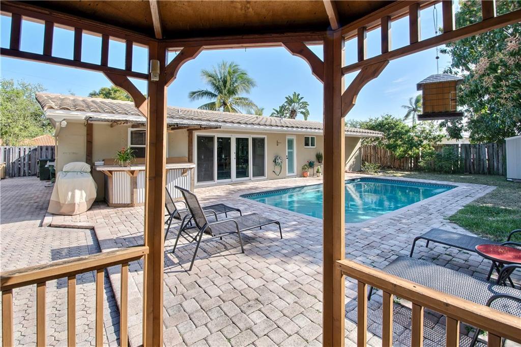 Beautifully updated 3bed/3full bath home in Imperial Point neighborhood. Featuring an open kitchen with quality wood cabinetry, S/S appliances, and granite countertops, open to the dining and living area. Tile and wood flooring throughout, hurricane impact windows, doors, plus a pavered circular driveway. The gazebo, outdoor bar, and cabana bath by the inviting pool make this an entertainer's paradise. Wonderful curb appeal w/covered entry. Trees and lush greenery surround this home. Make it your own!!