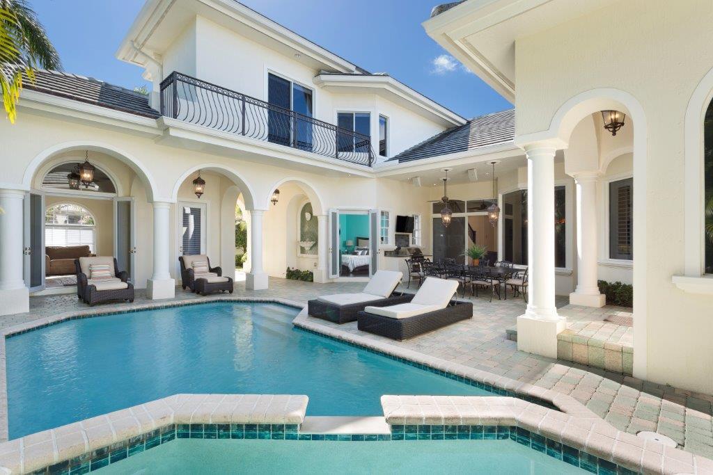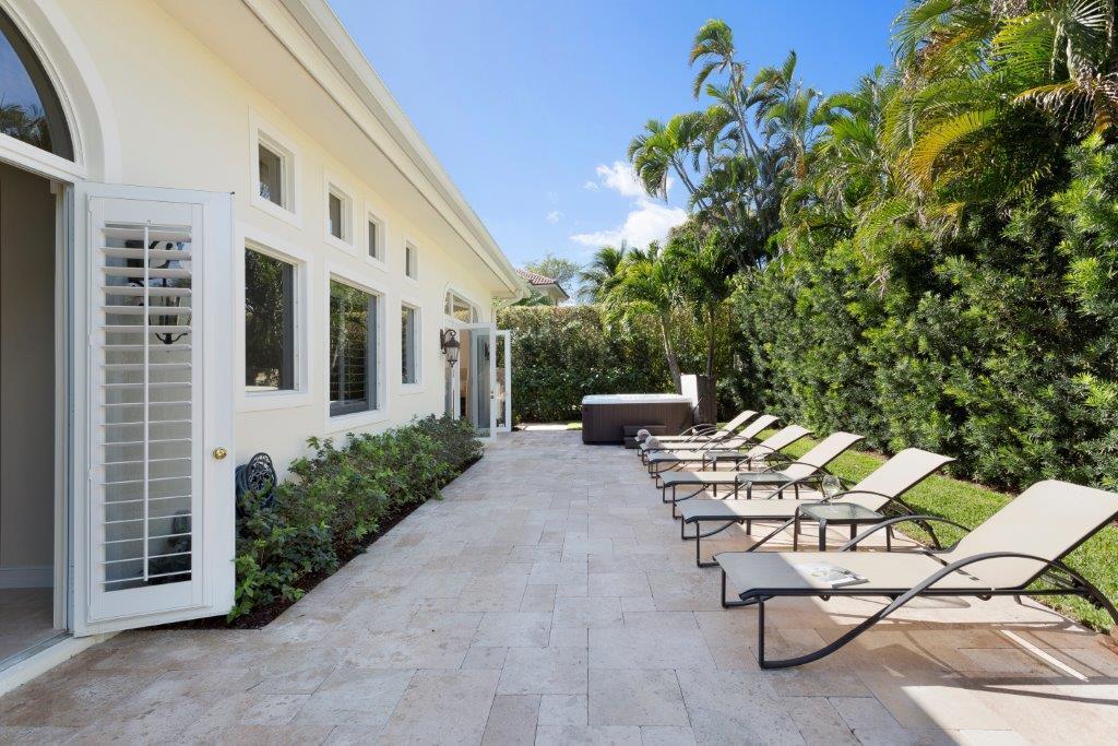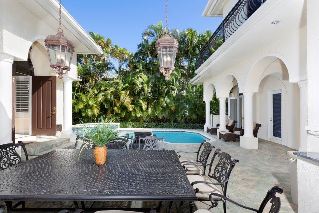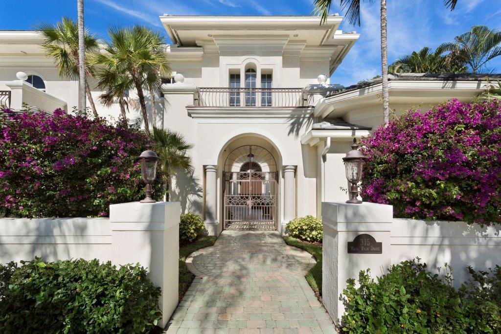 Tropical Georgian-inspired courtyard estate on Royal Palm's prestigious South Maya Palm Drive. A cobblestone paver circular motor court ushers guests to a gated courtyard with fountain and sun-splashed pool with spa. Cloaked in privacy..the double front doors open to an open free flowing design with creme marble floors in the main living areas. A first level master suite features rich hardwood floors,spa-like bath and private hedged patio for relaxing with a free standing hot tub. Open gourmet kitchen to breakfast and family room. Another bedroom suite views the pool. Upstairs two additional bedrooms' suite and loft offer family and friends privacy. A separate Guest/Carriage house offers a 5th bedroom with bath. Three-bay garage for the car enthusiast. Shown by appt.only.
